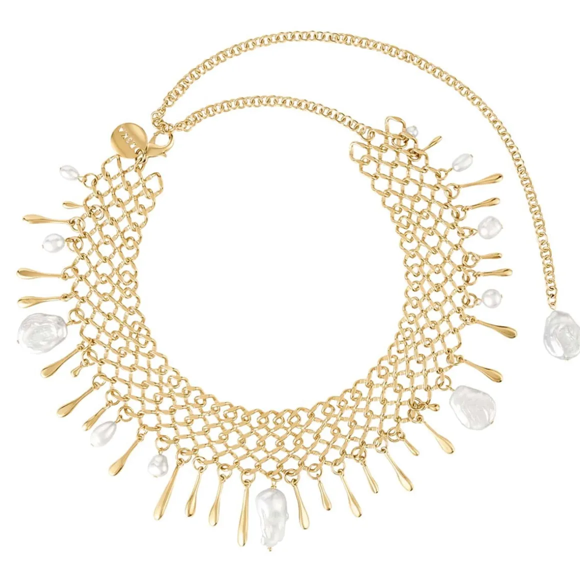 Kolia choker zachwyca misternym ażurowym splotem z pozłacanych ogniw, które układają się w delikatną, siatkową strukturę otulającą szyję niczym miękka koronka z metalu. W dolnej części naszyjnika zawieszono liczne złote, wydłużone elementy inspirowane kroplami spływającej wody, które dodają całości dynamiki i subtelnego ruchu. Między złoconymi zawieszkami umieszczono nieregularne perły, każda ma unikatowy kształt, dzięki czemu kolia zyskuje artystyczny charakter. Perły pięknie kontrastują z ciepłym odcieniem złota, wprowadzając do projektu lekkość i elegancję. Choker posiada regulowane zapięcie na łańcuszku, umożliwiające dopasowanie do różnych obwodów szyi. Na zakończeniu łańcuszka znajduje się dodatkowa perła, która pełni zarówno funkcję zdobniczą, jak i wykończeniową. Całość dopełnia zawieszka z logo ORSKA.