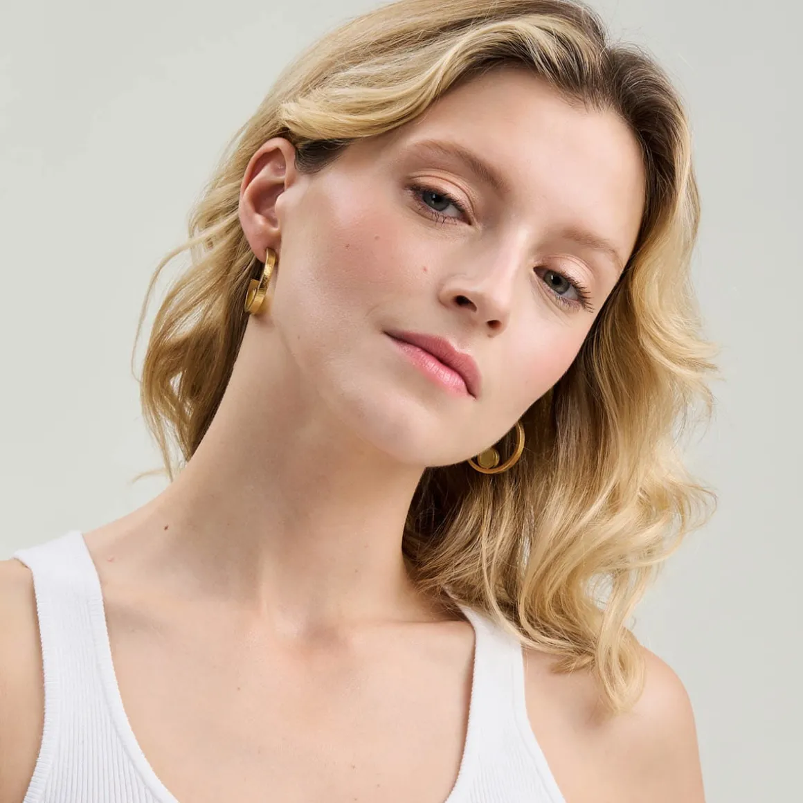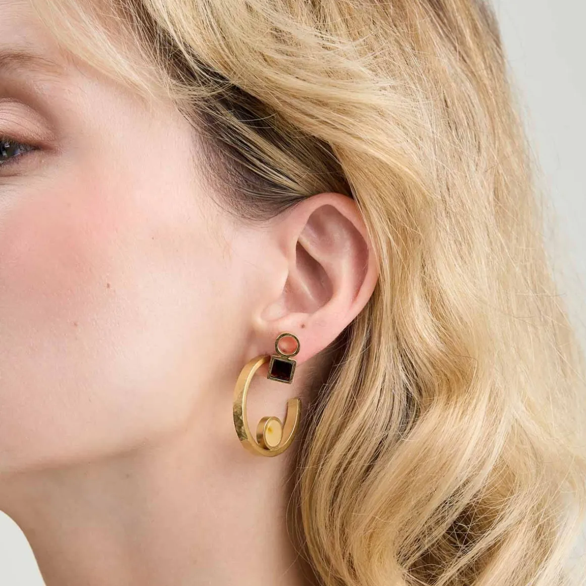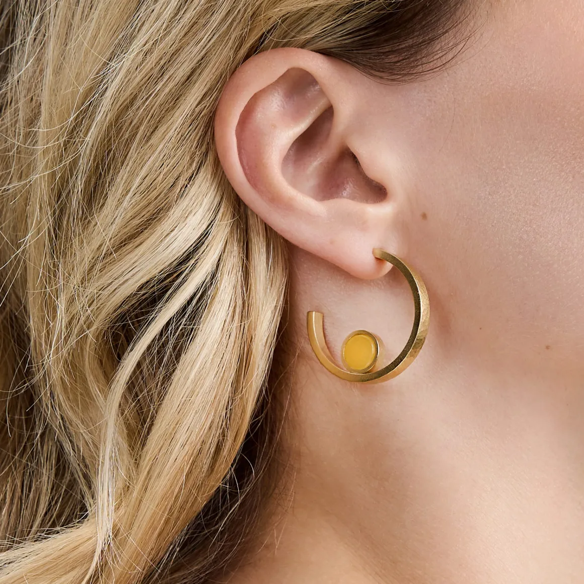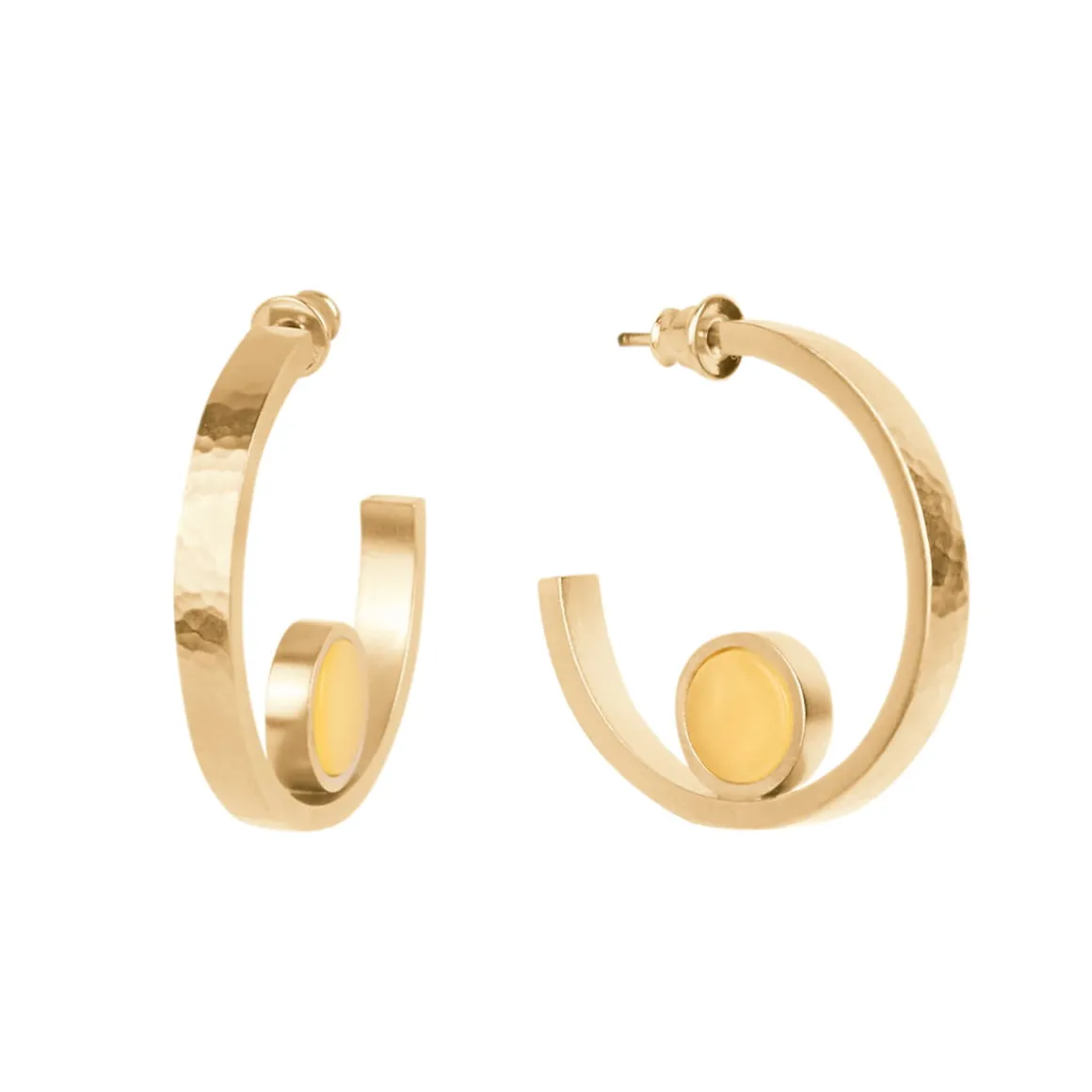 Kolczyki stworzyliśmy ręcznie z pozłacanego mosiądzu. Geometryczną, okrągłą formę ozdobiliśmy bursztynem, który osadziliśmy w pozłacanej oprawie. Kolczyki mają kontrastową powierzchnię – kutą na froncie, satynową po bokach. Zapięcie na sztyft oraz sztyfty wykonane zostały ze srebra. Bursztyny nieznacznie różnią się między sobą kolorem, dlatego każdy egzemplarz jest unikatowy.
