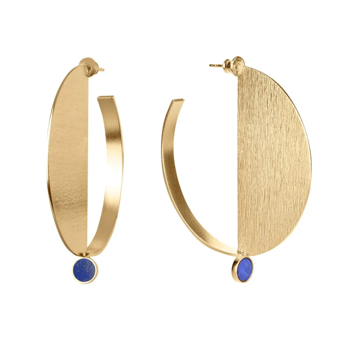Geometryczne kolczyki z kolekcji Orini to połączenie minimalistycznego designu i wyrazistej formy. Wykonane ręcznie z pozłacanego mosiądzu, zachwycają kontrastem między satynową, szczotkowaną powierzchnią dużego, półkolistego elementu a delikatnym, głęboko niebieskim akcentem lapis lazuli w okrągłej oprawie. Ich asymetryczna konstrukcja tworzy efektowne wrażenie lekkości i nowoczesnej elegancji, idealnej zarówno na co dzień, jak i na specjalne okazje. Kolczyki doskonale uzupełniają inne elementy kolekcji Orini, takie jak bransoletki czy pierścionki, tworząc spójny zestaw dla miłośniczek niebanalnej biżuterii.
