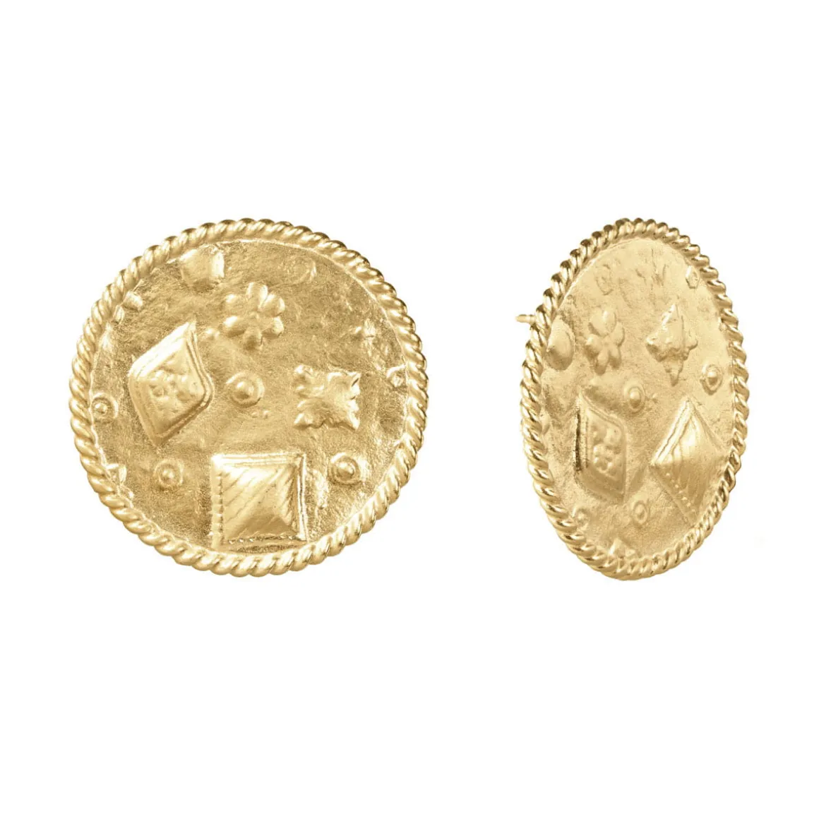 Kolczyki przyciągają uwagę powierzchnią, bogato zdobioną licznymi ornamentami. Wzór łączący motywy roślinne z elementami geometrycznymi wybiliśmy na tle, które fakturą przypomina powierzchnię starych monet. Całość wykończona została ozdobną ramą uformowaną na wzór plecionego sznura lub okolicznościowego medalionu. Kolczyki zostały wykonane ręcznie z pozłacanego mosiądzu. Dzięki zapięciu na sztyft są nie tylko efektowne, ale i komfortowe w noszeniu, sprawdzą się więc zarówno na co dzień, jak i przy specjalnych okazjach.