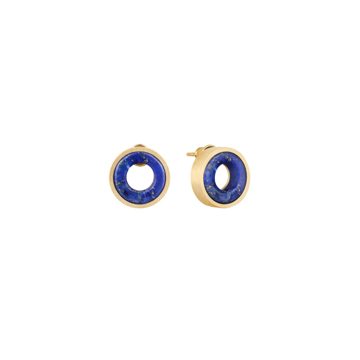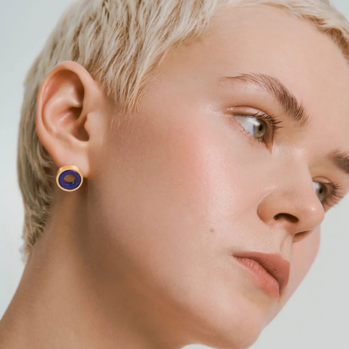 Pozłacane kolczyki z kolekcji Orini wykonaliśmy w naszej jubilerskiej pracowni z mosiądzu, który pokryliśmy ciepłym złoceniem, nadając im eleganckiego blasku. Głównym elementem kolczyków jest pierścień z ultramarynowego lapis lazuli, którego piękno podkreśla ręczne szlifowanie. Naturalny kamień oprawiliśmy w pozłacane ramy. Subtelny okrągły kształt kolczyków czyni je uniwersalnym dodatkiem. Biżuteria doskonale sprawdzi się jako akcent do minimalistycznych stylizacji na co dzień, ale równie pięknie dopełni elegancki wieczorowy look. Kolczyki dostępne są również w srebrnej wersji kolorystycznej.