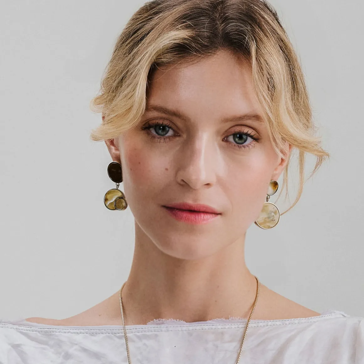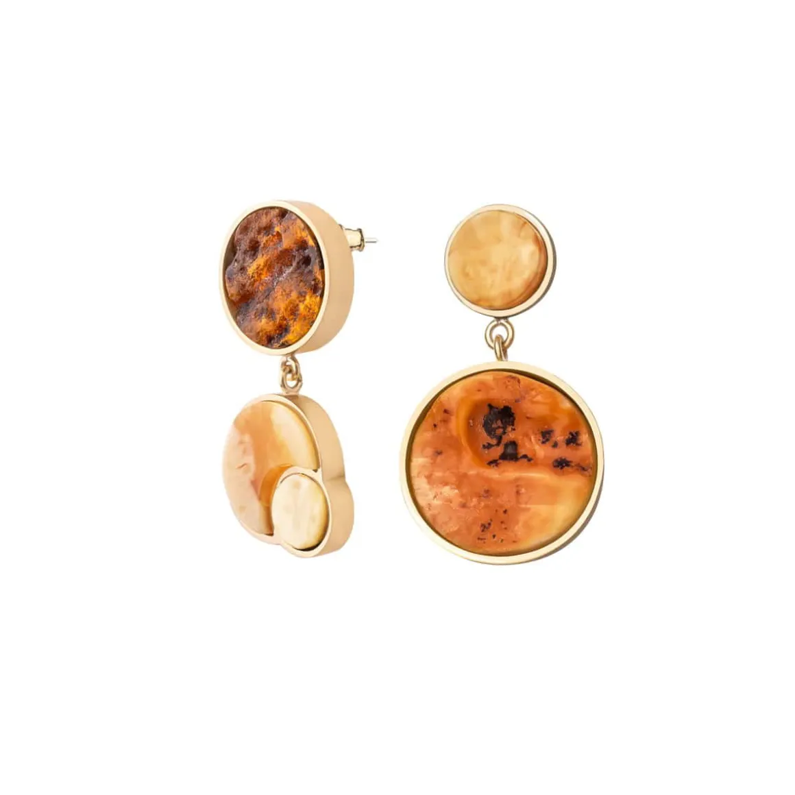 Jak zróżnicowane potrafią być kolory bursztynu pokazuje pięć okrągłych, wielobarwnych kamieni oprawionych w pozłacany mosiądz. Proste, geometryczne formy podkreślają unikatowość i naturalne piękno surowca. Nowoczesny design jest tłem dla prawdziwej gwiazdy kolekcji – stworzonego miliony lat temu bursztynu. Kamienie różnią się między sobą kolorem oraz inkluzjami, dzięki czemu każda para kolczyków jest unikatowa. Kolczyki są w 100% wykonane ręcznie.