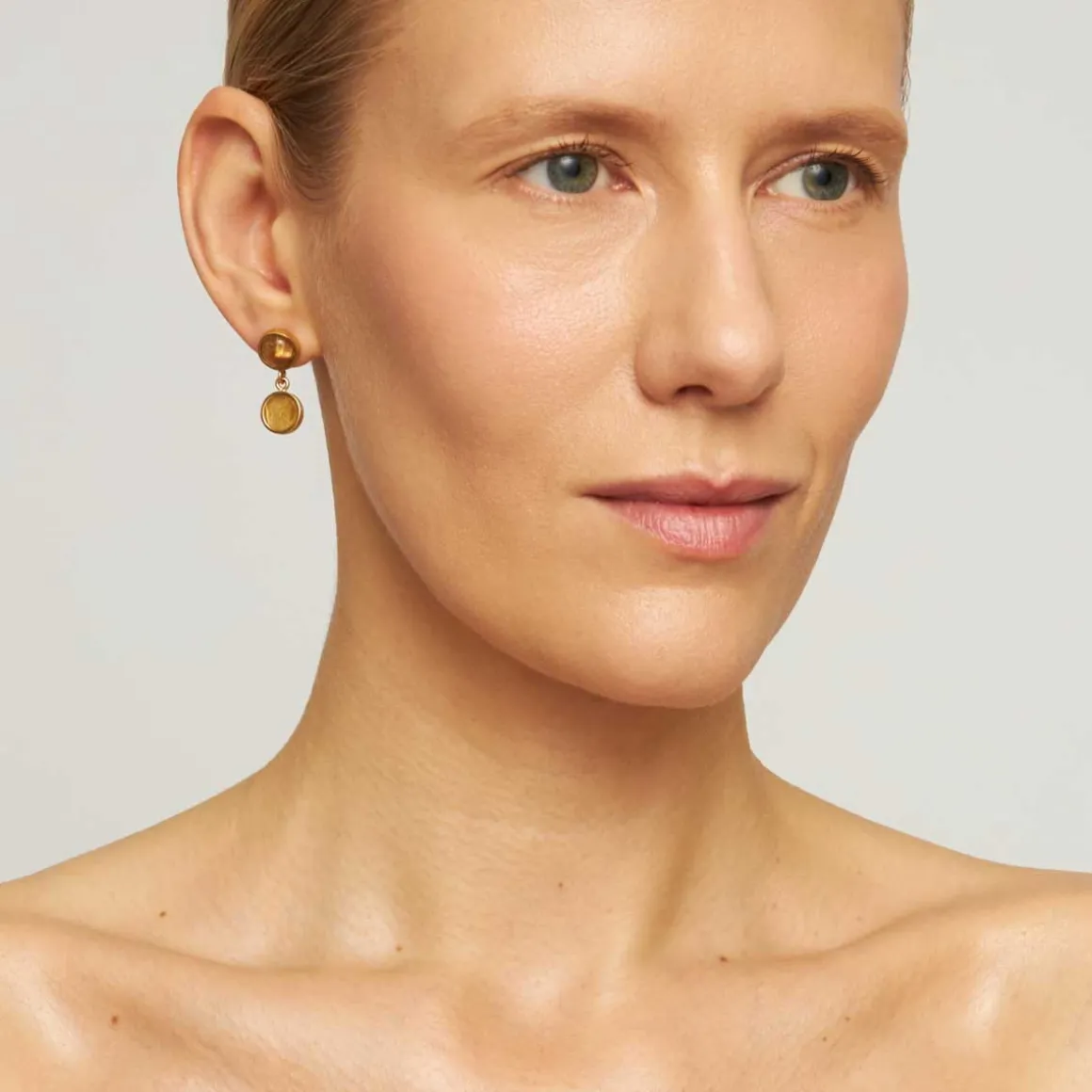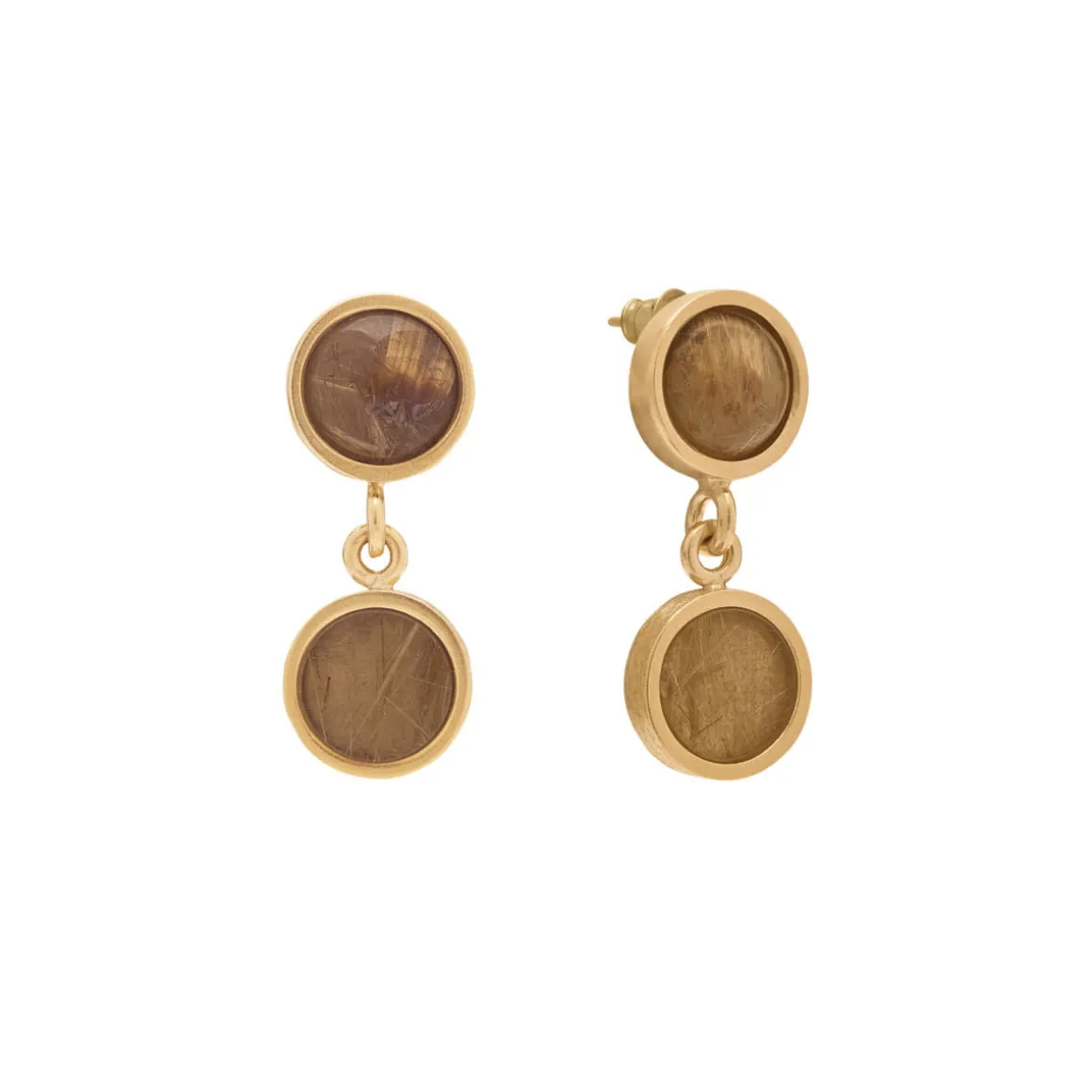 Kolczyki z kolekcji Gelato to harmonijne połączenie ciepłych, miodowych tonów, które oczarują każdą miłośniczkę klasycznej biżuterii. Górną część kolczyka tworzy okrągły kwarc rutylowy oprawiony w pozłacaną ramę. Jego bursztynowokarmelowy odcień połyskuje w świetle, odsłaniając unikalne złote igiełki rutylu, które są niczym promienie słońca uwięzione w krysztale. Do kamienia przymocowano płaski kwarc rutylowy w jaśniejszym tonie, który subtelnie kołysze się przy każdym ruchu. Gra odcieni ciepłej palety barw sprawia, że kolczyki są zarówno eleganckie, jak i pełne słonecznej energii. Zapinane na wygodny sztyft, doskonale sprawdzą się do noszenia przez cały dzień.