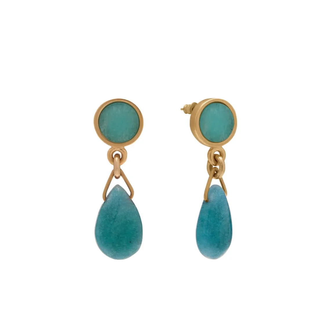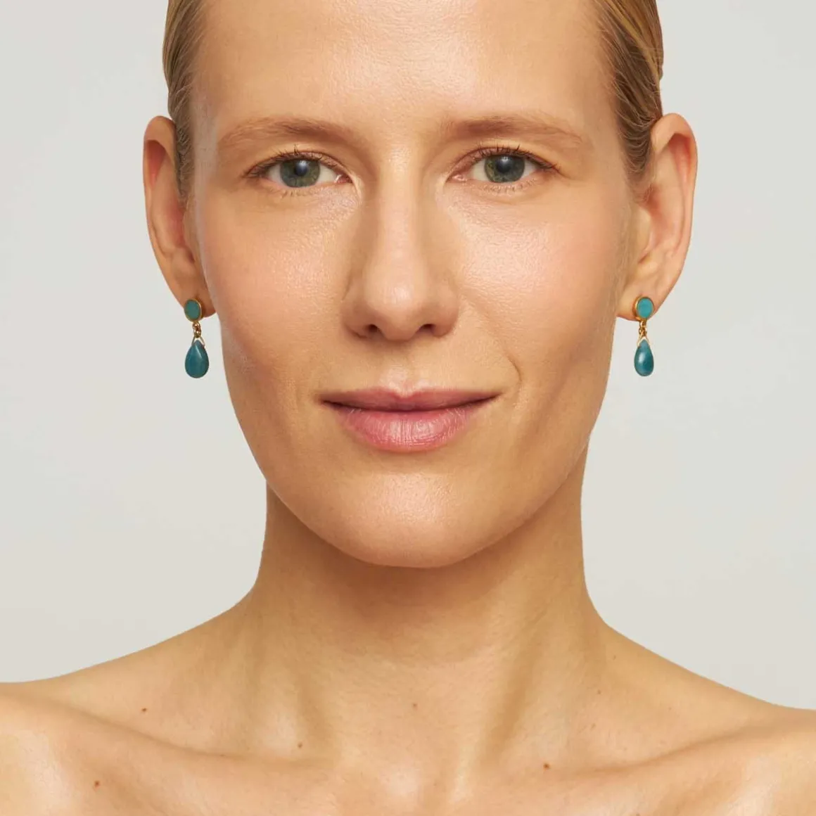 Kolczyki z kolekcji Gelato to połączenie dwóch niebieskich kamieni. Górną część przy sztyfcie zdobi oszlifowany, gładki amazonit w kolorze turkusowym, oprawiony w okrągłą ramę. Do niego przytwierdzono wiszący niebieski agat w kształcie łezki. Gładka, błyszcząca powierzchnia kamieni kontrastuje z ciepłą, pozłacaną oprawą. Kolczyki są lekkie, wygodne i zapinane na sztyft, co sprawia, że idealnie nadają się do noszenia przez cały dzień. Każda para jest niepowtarzalna – naturalne różnice kolorze kamieni sprawiają, że kolczyki mogą nieco różnić się od egzemplarza przedstawionego na zdjęciu.