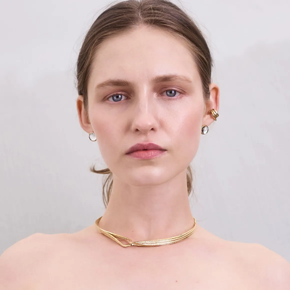 Krótki naszyjnik z kolekcji Prato wykonaliśmy ręcznie w pracowni ORSKA z pozłacanego mosiądzu. Długie źdźbła trawy, o wyraźnie odwzorowanych detalach struktury, spletliśmy razem tworząc symboliczny węzeł. Z tyłu łańcuszka dodaliśmy dodatkowy, krótki łańcuszek zakończonym transparentnym kryształem górskim w formie kropli. W biżuterii z kolekcji Prato węzeł symbolizuje naszą pierwotną więź z Ziemią. Tym samym jest nie tylko estetycznym elementem, ale i głębokim przypomnieniem o nierozerwalnym połączeniu człowieka z naturą.