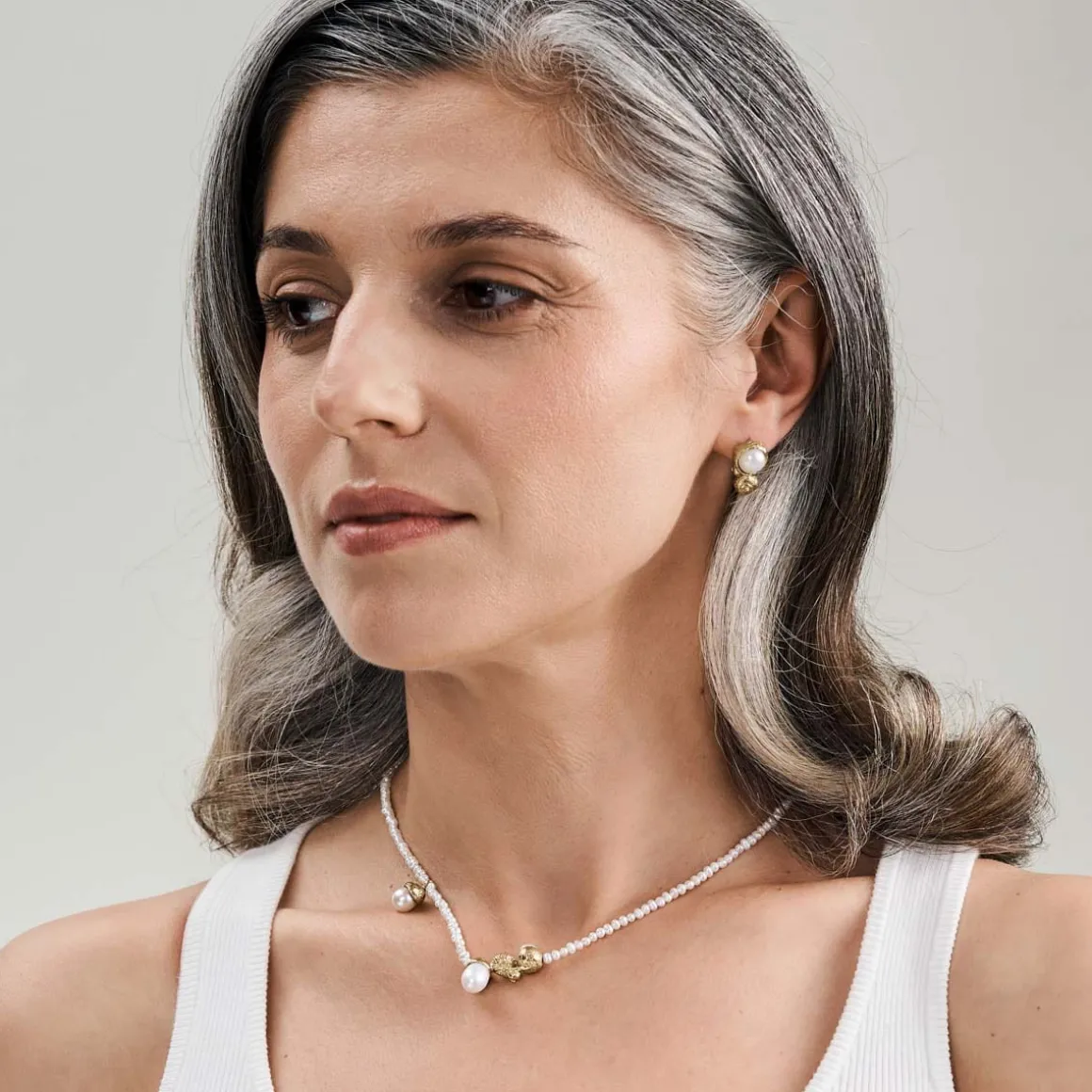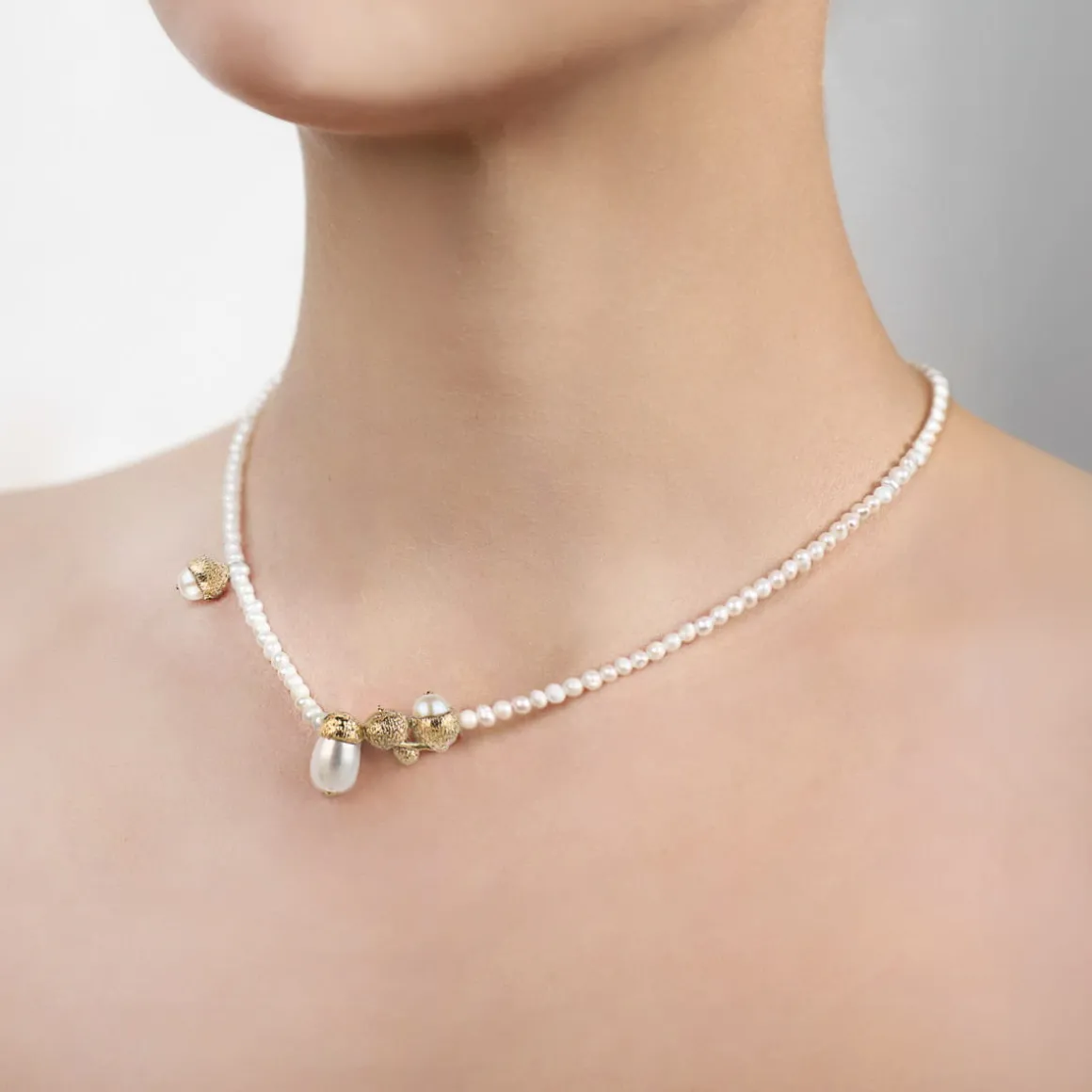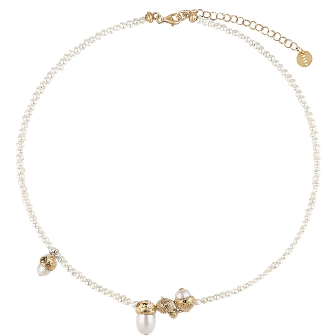 Sznur drobnych, nieregularnych pereł zdobią niesymetryczne zawieszki. W pozłacanych skorupkach żołędzi osadzono naturalne perły. Całość uzupełnia małe logo ORSKA, kilkucentymetrowa przedłużka i zapięcie na karabińczyk w złotym kolorze. Elegancki naszyjnik z kolekcji Bery pasuje zarówno do białej koszuli jak i wieczorowej kreacji. Na przekór konwenansom warto go również zestawić ze sportowym t-shirtem, aby dodać stylizacji odrobiny blasku. Naszyjnik, razem z długimi lub krótkimi kolczykami na sztyft, utworzy duet, któremu nie oprze się żadna specjalna okazja.