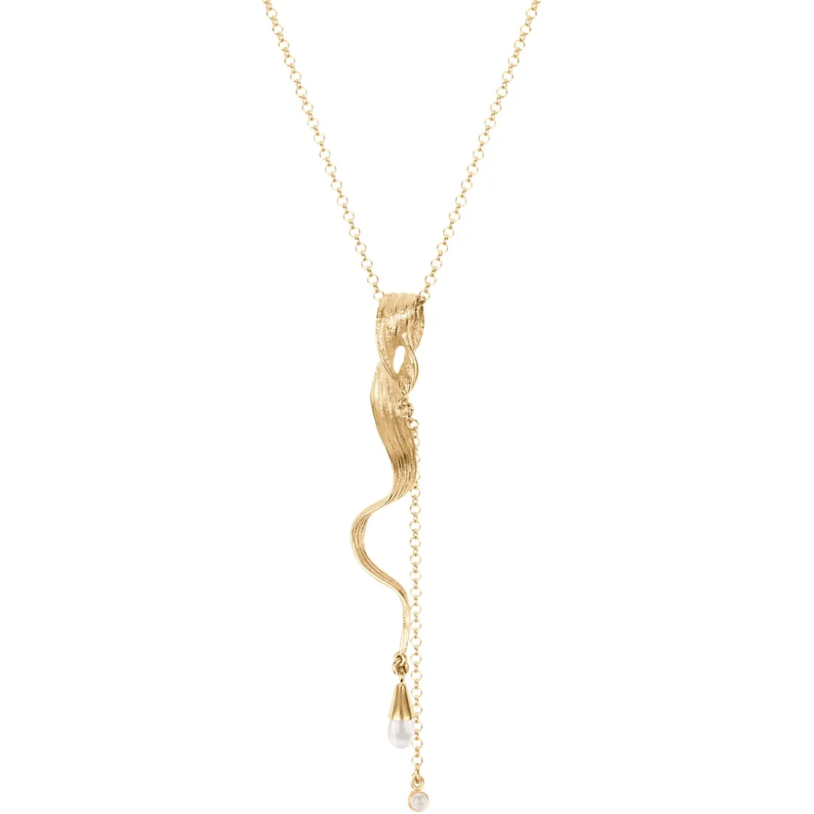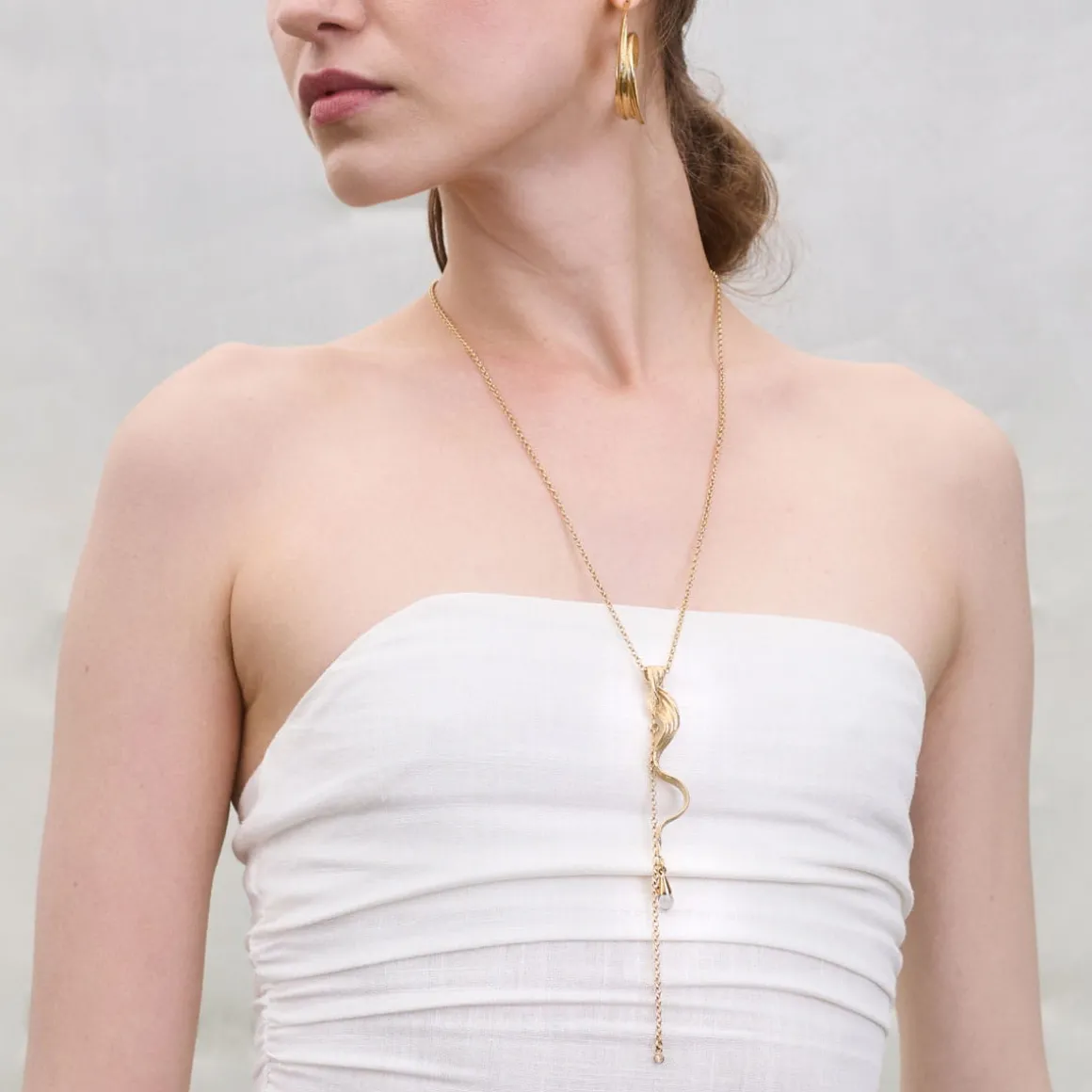 Naszyjnik wykonaliśmy ręcznie w pracowni ORSKA z pozłacanego mosiądzu. Łańcuszek o drobnych oczkach ozdobiliśmy okazałą zawieszką w kształcie pofalowanego źdźbła trawy. Dzięki starannie odwzorowanym detalom struktury trawy wisior ma naturalny, organiczny wygląd. Zawieszka ozdobiona została kryształem górskim w formie kropli. Idealnie transparentny kwarc wygląda jak krople rosy, który zraszają łąkę o poranku. Naszyjnik tworzy także krótki łańcuszek podwieszony z przodu i zakończony okrągłym kryształem. Długi naszyjnik jest subtelny i elegancki. Sprawdzi się jako uzupełnienie zwiewnych, letnich stylizacji, ale będzie także doskonale współgrać z ciepłym swetrem. Łącz go z innymi wzorami z kolekcji Prato i stwórz swoją łąkę!