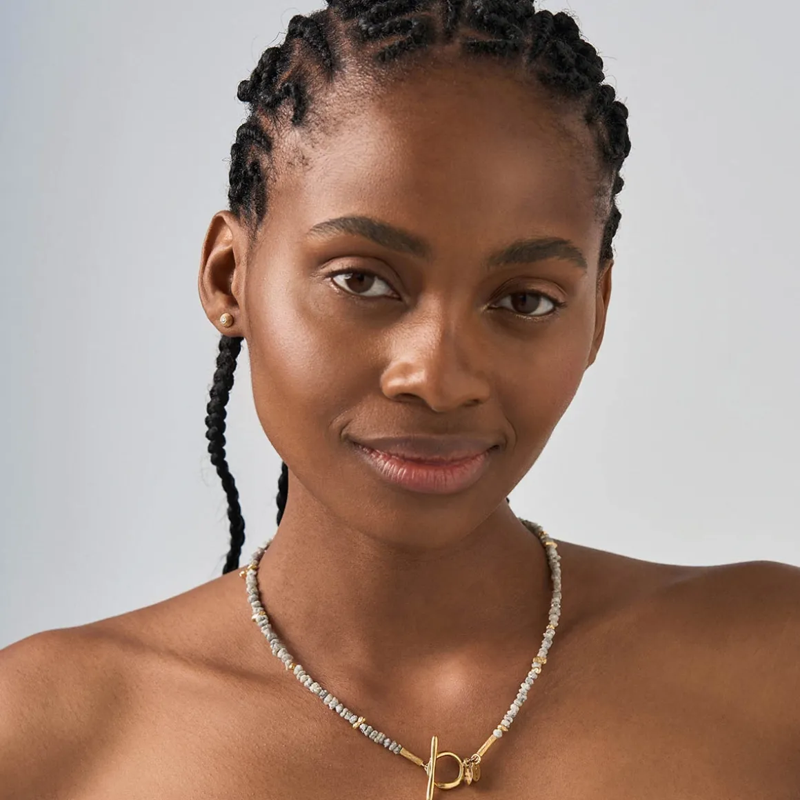 Diamentowy naszyjnik został wykonany ręcznie. Sznur nieoszlifowanych, nieregularnych bryłek diamentów przepleciono bryłkami pozłacanego srebra próby 925. Każdy z kamieni ma unikatowy kształt i barwę. Surowe diamenty przywodzą na myśl iskrzące w słońcu sople lodu. Oryginalnie skontrastowano je z ciepłym, złotym kolorem. Kompozycję artystycznego naszyjnika zamyka blaszka Limited Edition i logo ORSKA. Naszyjnik dodatkowo zdobi zapięcie toggle, które jednocześnie pełni funkcję zawieszki. Toggle składa się z dwóch elementów: pałeczki i okręgu. Mechanizm zapinania jest prosty i polega na przełożeniu pałeczki przez obręcz. Efektowny naszyjnik z diamentami sprawdzi się zarówno w codziennych, jak i wieczorowych sytuacjach. Stylizację może uzupełnić diamentowa bransoletka lub drobne kolczyki na sztyft z nieoszlifowanymi diamentami. Razem stworzą kompozycję, która nie umknie żadnemu spojrzeniu.
