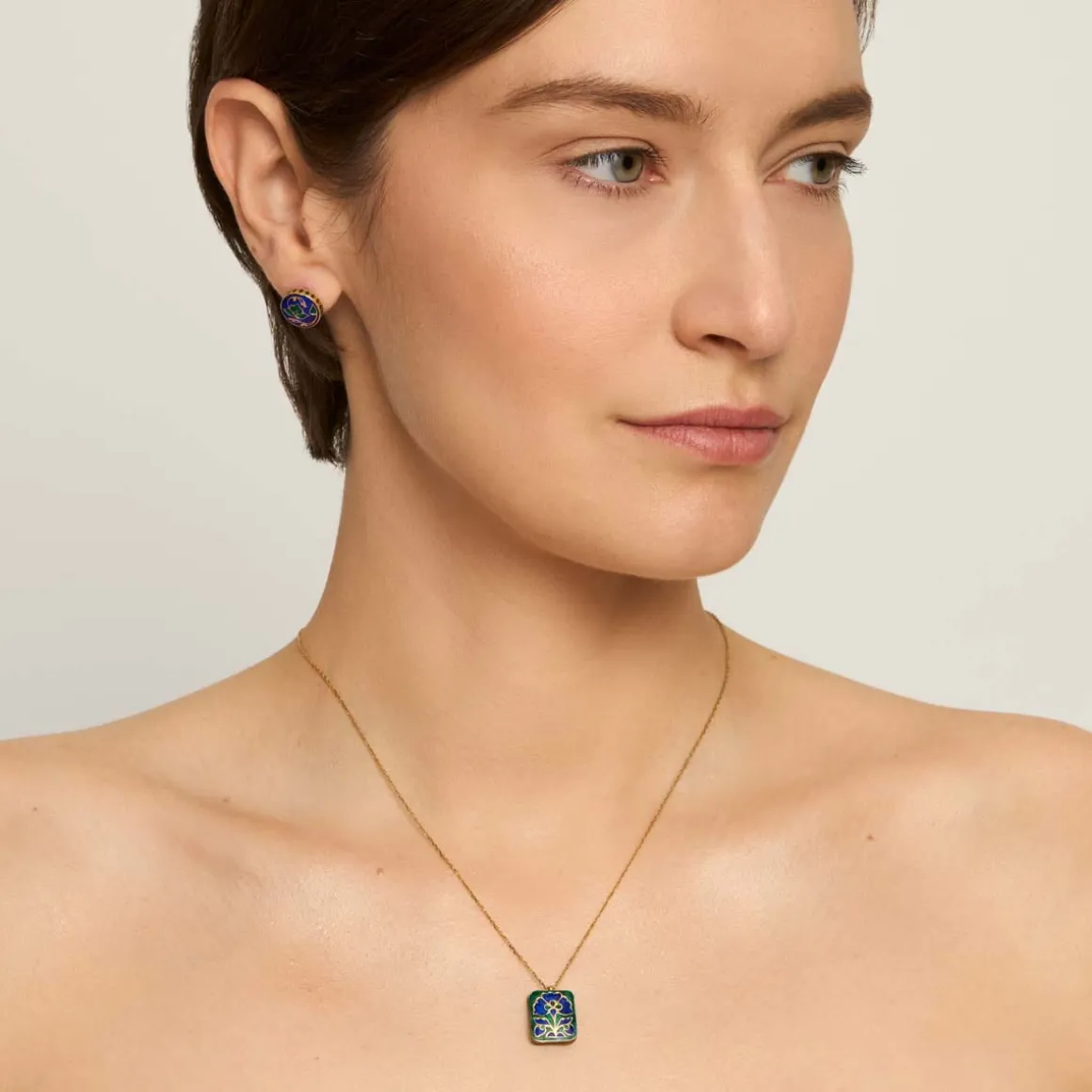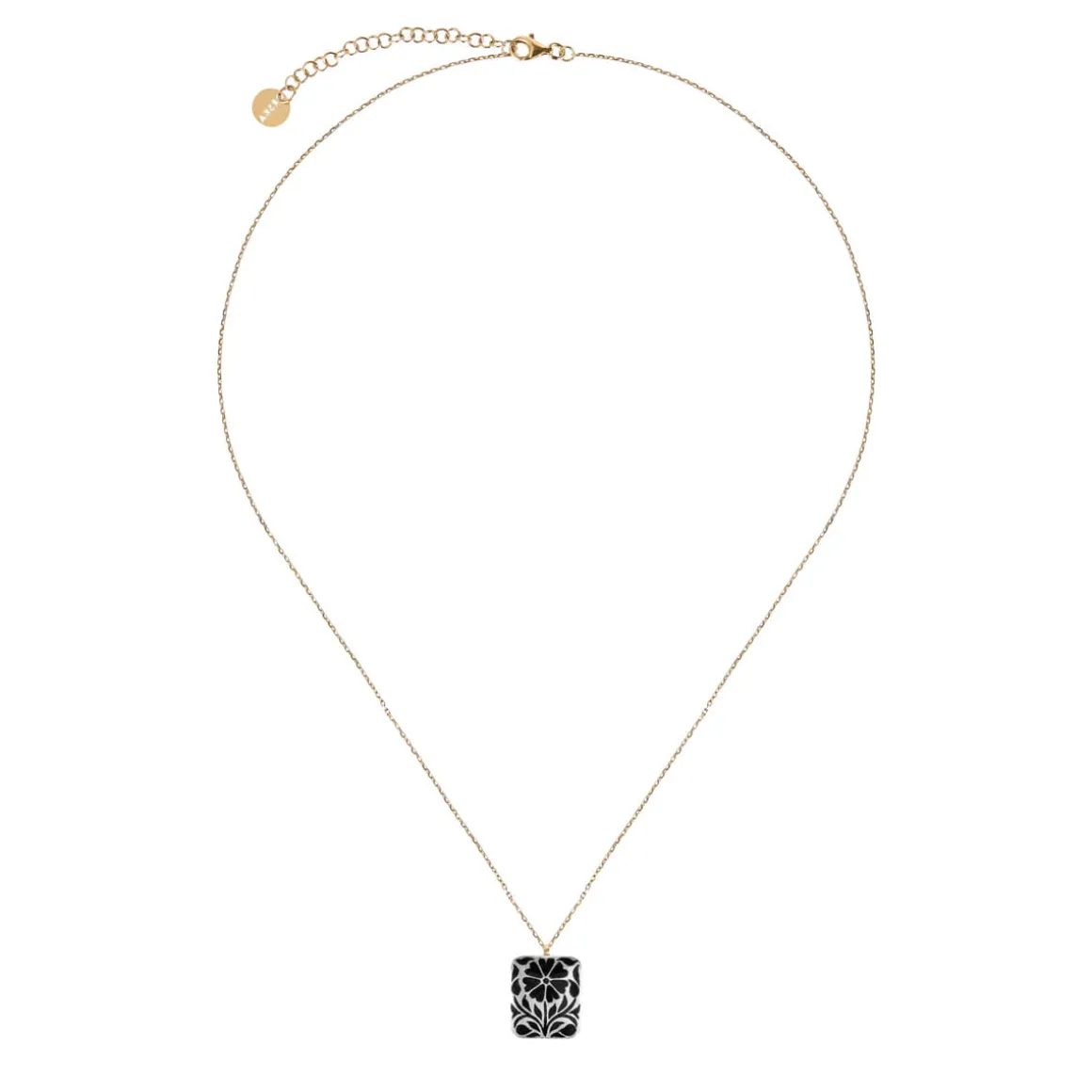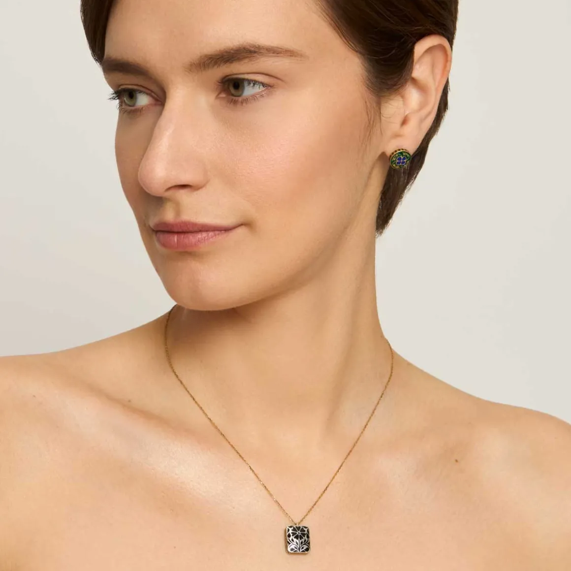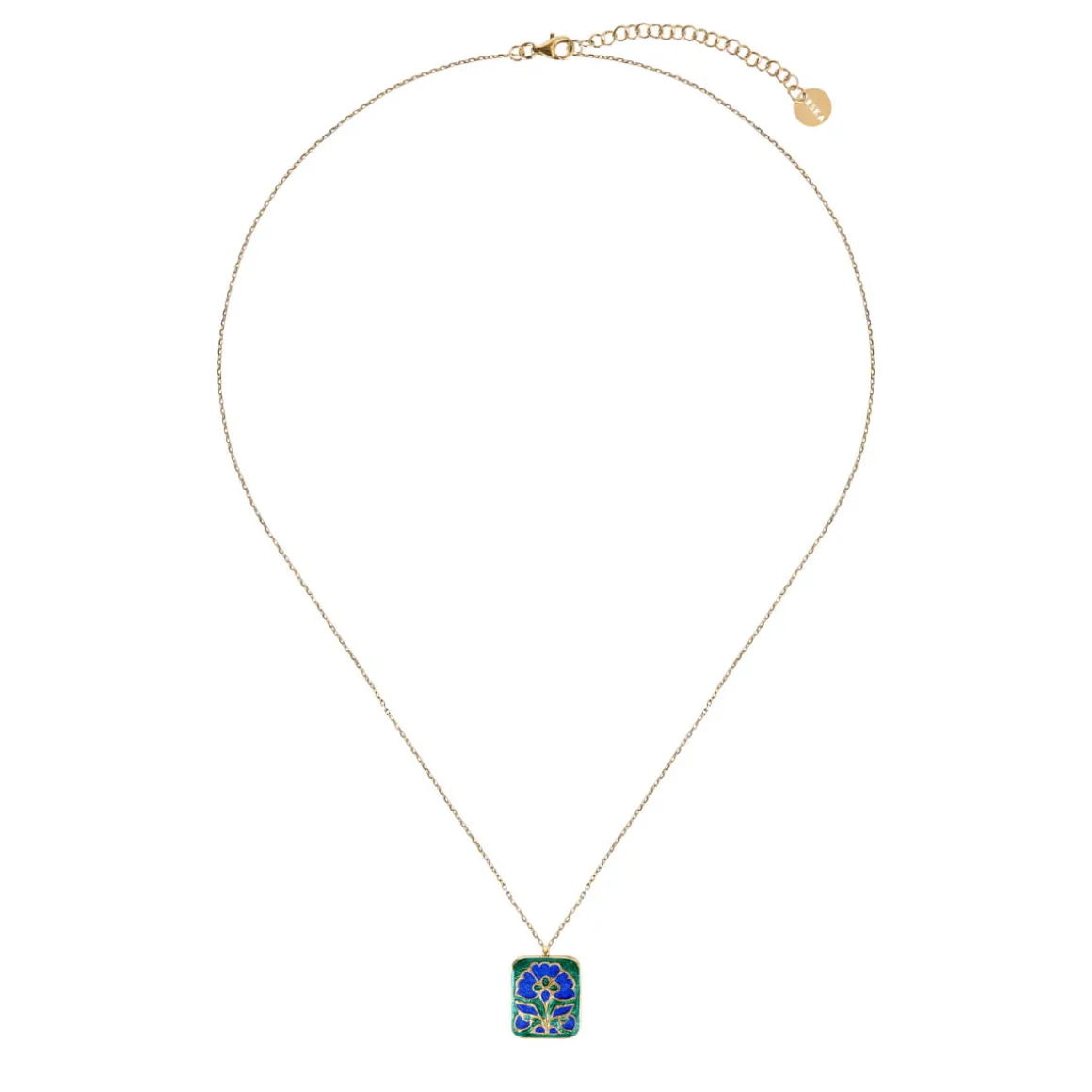 Naszyjnik na delikatnym łańcuszku wykonano z pozłacanego srebra. Jego centralnym elementem jest dwustronna zawieszka, bogato zdobiona mineralną emalią. Z jednej strony przedstawia czarny kwiat nagietka na srebrnym tle, tworząc elegancką, stonowaną kompozycję. Na odwrocie znajduje się intensywnie niebieski kwiat klitorii, otoczony zieloną emalią, który nadaje całości wyrazistego, świeżego charakteru. Dekoracyjne ornamenty zdobią również brzegi zawieszki – na pozłacanej powierzchni namalowano czarne pnącza, oplatające formę niczym symbol trwałych, nieprzemijających więzi.