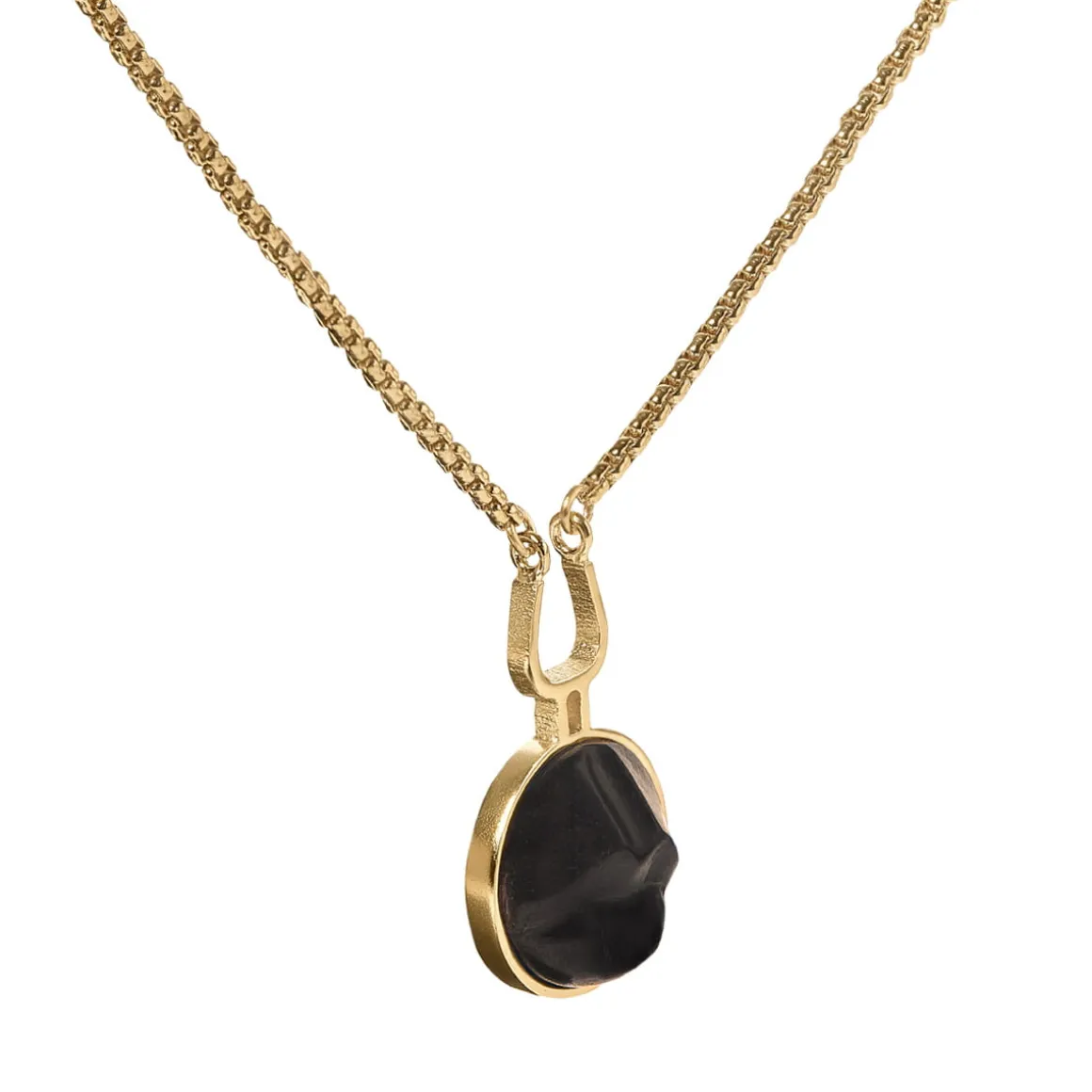 W naszyjniku uwagę przyciąga zawieszka w kształcie koła wykonana z ciemnego, lśniącego drewna arang, pochodzącego z balijskich lasów. To materiał wybierany przez lokalnych rzemieślników od pokoleń, nie tylko ze względu na trwałość i strukturę, która pozwala na precyzyjne rzeźbienie detali, ale również z powodu jego szlachetnej niemalże czarnej barwy. Z tego drewna balijscy mistrzowie wyrzeźbili usta, które w pracowni ORSKA oprawiliśmy w kształt okrągłego wisiorka. Naszyjnik dopełnia łańcuszek zakończony przedłużką, która umożliwia regulację długości. Całość została wykonana z mosiądzu pozłacanego, którego blask zadziornie kontrastuje z ciemnym drewnem.