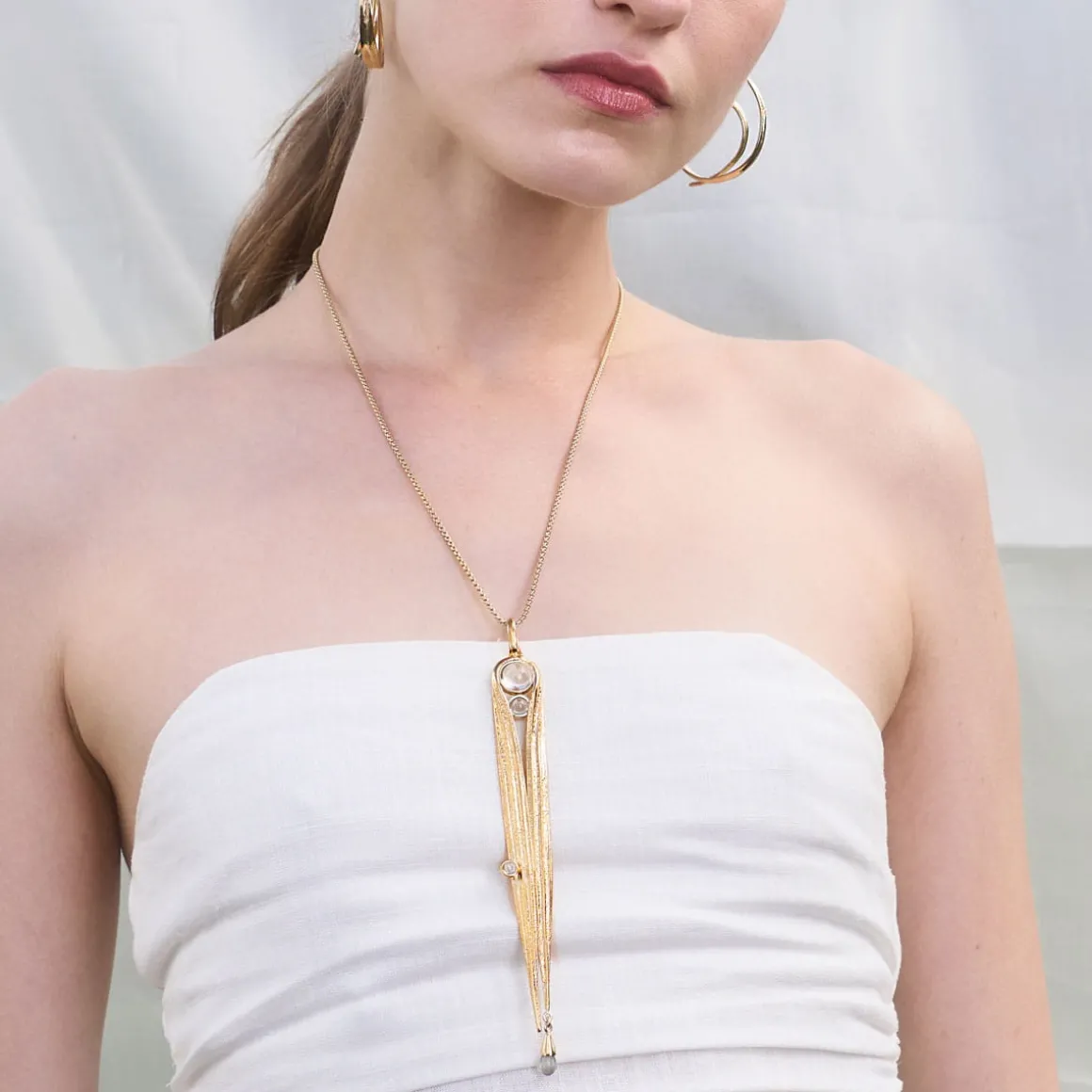 Naszyjnik wykonaliśmy ręcznie w pracowni ORSKA z pozłacanego mosiądzu. Na długim łańcuszku o ciasnym splocie zawiesiliśmy dwa źdźbła trawy złączone w długi wisior. Dzięki starannie odwzorowanej strukturze liścia trawy zawieszka ma naturalny, realistyczny wygląd. Całość ozdobiliśmy kryształem górskim. Trzy transparentne kwarce mają okrągły kształt, a jeden z nim ma formę kropi. Kryształ górski w naszyjniku z kolekcji Prato budzi skojarzenia z rosą, która o poranku zwilża zieloną łąkę. Krople wody na trawie są chwilowe, szybko wysychają pod wpływem słońca. Symbolizują ulotność chwili, przemijalność czasu i potrzebę doceniania obecnych momentów. W długim, pozłacanym naszyjniku kryształowa rosa będzie cieszyć oko niezależnie od upływu czasu.