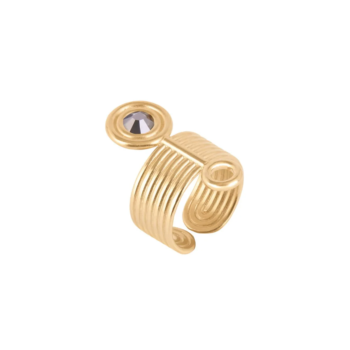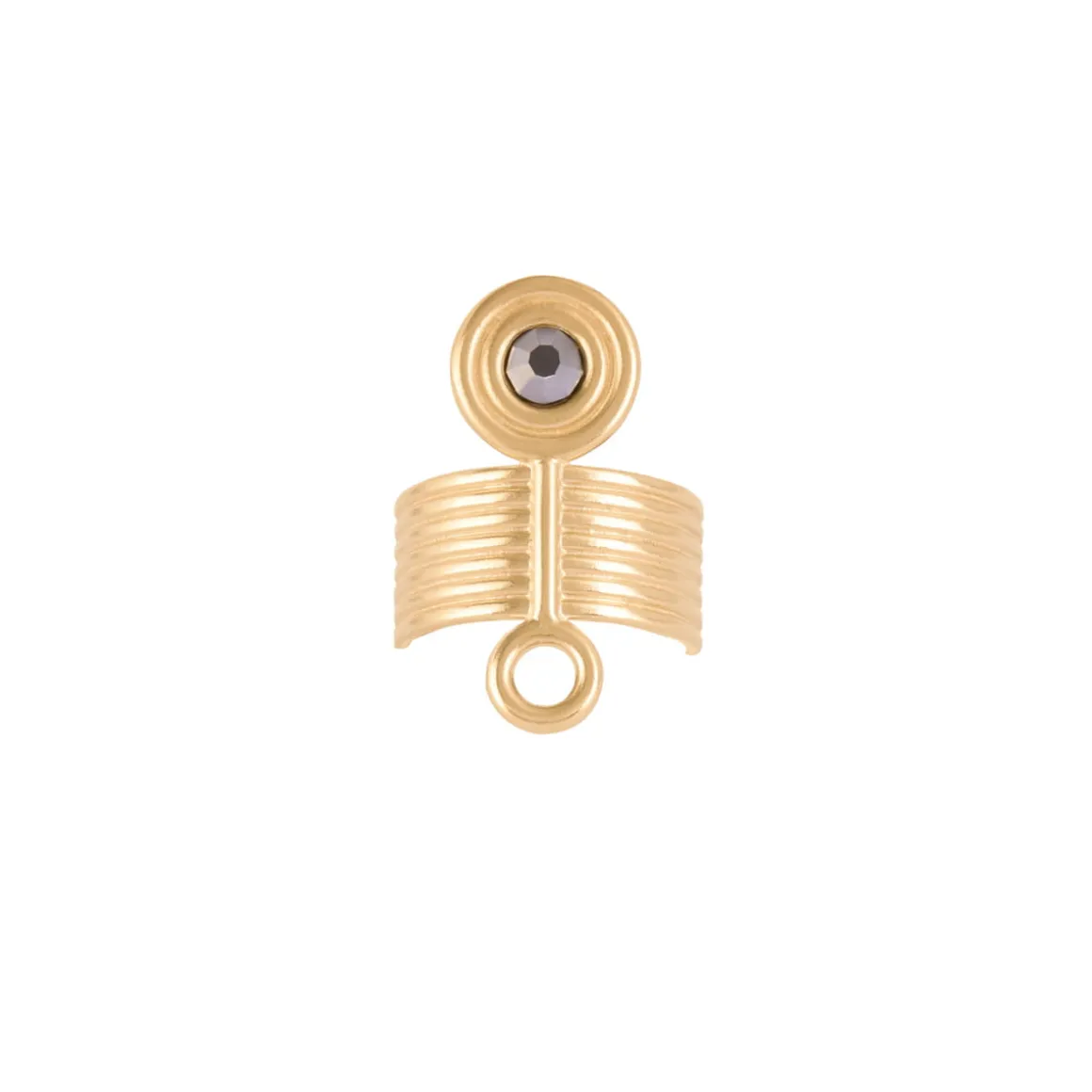 Pierścionek z kolekcji Holos został odlany z mosiądzu, a następnie pozłocony. Pierścionek ma kształt szerokiej, otwartej obrączki. Biżuteria powstała z połączenia pozłacanych pręcików, które w pionie przecina prostopadłe zdobienie, zakończone po obu stronach okręgami. Nawiązująca do widoku pól z lotu ptaka forma, uzupełniona o kryształ w kolorze hematytowej szarości, jest naszym autorskim symbolem żywiołu Ziemi. Ten najbliższy człowiekowi żywioł kojarzony jest z opiekuńczą energią, dającą oparcie, poczucie bezpieczeństwa, pokarm i schronienie.