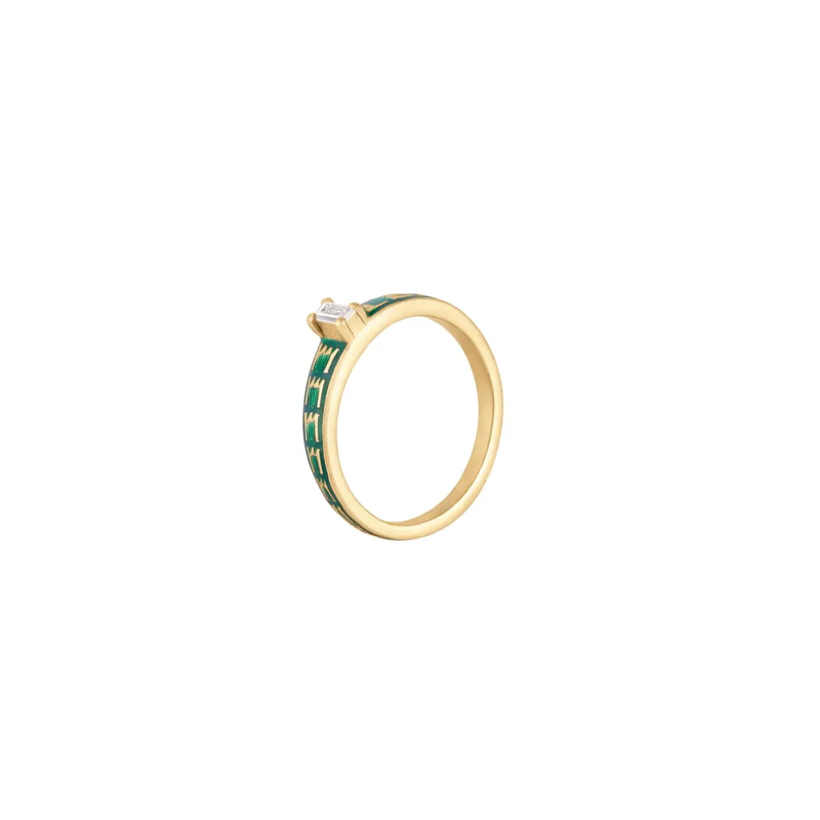 Pierścionek powstał z pozłacanego srebra. W centrum pierścionka umieszczono prostokątne oczko z kundan glass czyli wysokiej jakości tradycyjnego indyjskiego szkła, oprawionego w pozłacaną koronę. Powierzchnię delikatnej obrączki zdobią zielone ornamenty ręcznie namalowane przy użyciu mineralnego szkliwa. Każda linia została precyzyjnie nałożona, na powierzchnię metalu i wypalona w piecu, by trwale zespolić się z metalem. Zieleń w zdobieniach symbolizuje harmonię i równowagę. To kolor odnowy i nowych początków. Pierścionek jest subtelny w formie, ale bogaty w zdobieniach. Można go nosić solo jako delikatny akcent lub komponować z innymi pierścionkami z kolekcji, tworząc indywidualne zestawy.