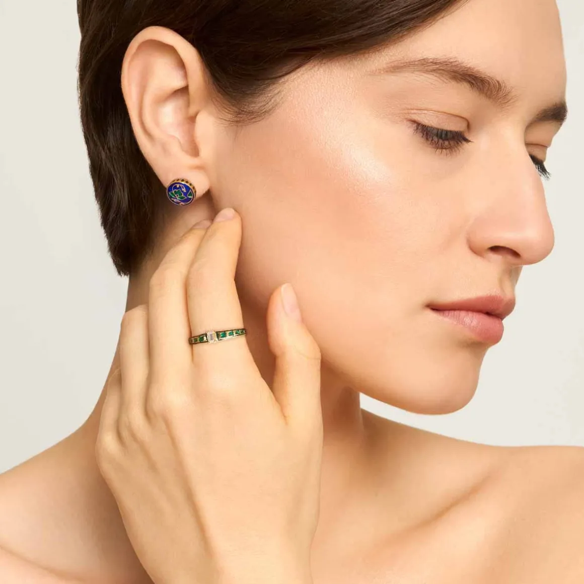 Bogato zdobione pierścionki z kolekcji Minakari można nosić na wiele sposobów, łącząc je w lekkie, indywidualne kompozycje. Doskonale wyglądają założone kaskadowo na jednym palcu lub gdy rozłożone są na kilku palcach obok siebie, tworząc mozaikę kolorów i wzorów. Zielone ornamenty na pozłacanym srebrze pięknie współgrają z innymi pierścionkami z tej kolekcji – zarówno z delikatnym pierścionkiem zdobionym czarną emalią jak i szeroką obrączką z zielono-niebieskim ornamentem. Możesz także łączyć je z pierścionkami z kolekcji Aurora, gdzie z surowymi turmalinami w różowych, zielonych i błękitnych odcieniach stworzą kontrastujące zestawienie. Delikatne pierścionek z zieloną emalią współgra z naszyjnikami i bransoletkami z kolekcji Minakari, tworząc spójny komplet pełen symboli. To biżuteria, którą można nosić codziennie, bawić się kolorem, łączyć kontrasty i tworzyć własne zestawy, które nigdy nie wyglądają tak samo, a zawsze przyciągają spojrzenia.