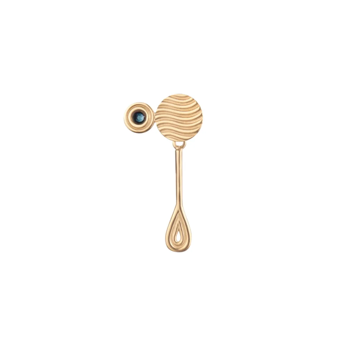 Woda niesie ze sobą życie. Jest symbolem odrodzenia i wytrwałości. W pracowni ORSKA przełożyliśmy moc żywiołu wody na elegancką przypinkę. Pin z kolekcji Holos został odlany z mosiądzu, a następnie pokryty złotem. Swoim kształtem nawiązuje do spływającej kropli. Górna, okrągłą część pinu powstała z połączenia mosiężnych pręcików w miękkie linie, które naśladują morskie fale, nadając całości elegancji. Kompozycję uzupełnia kryształ o niebieskiej barwie.