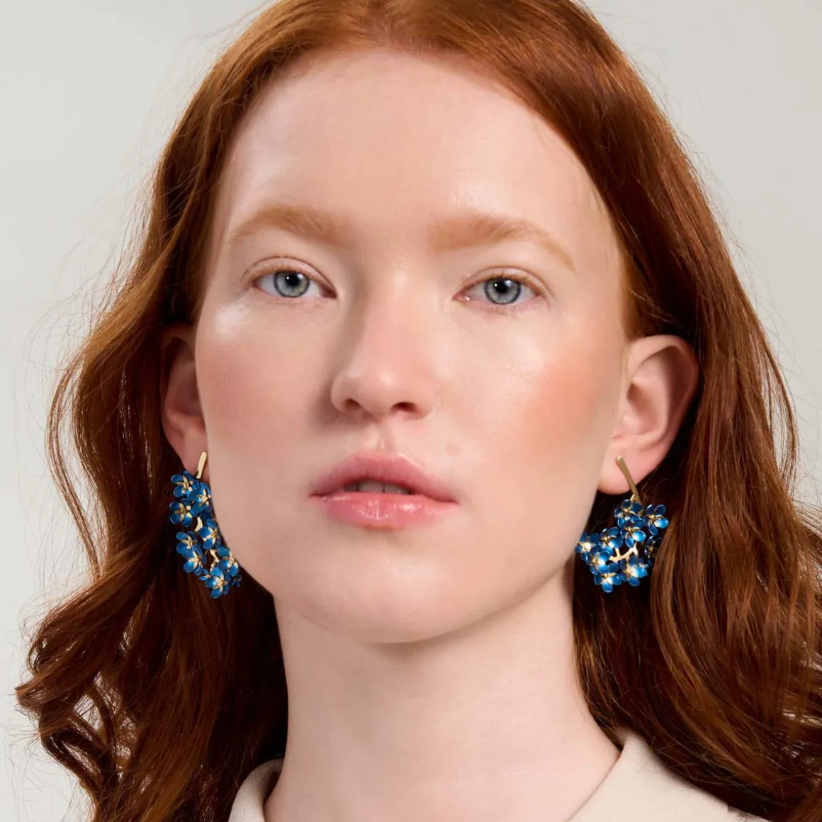 Asymetryczne, wiszące kolczyki zostały ręcznie wykonane z pozłacanego mosiądzu. Złotą łodygę ozdobiono pękiem drobnych, błękitnych, ręcznie malowanych niezapominajek, które powstały z pomocą zegarmistrzowskich śrubek. Urocze kwiaty przekazują niemą prośbę o pamięć i noszenie w sercu osoby obdarowującej. Dzięki temu są znaczącym prezentem zarówno dla przyjaciół, rodziny jak i ukochanych. Efektowne i eleganckie przyciągają uwagę. Dzięki oryginalnemu, organicznemu designowi dodadzą dziewczęcego uroku i wiosennej świeżości każdej stylizacji.