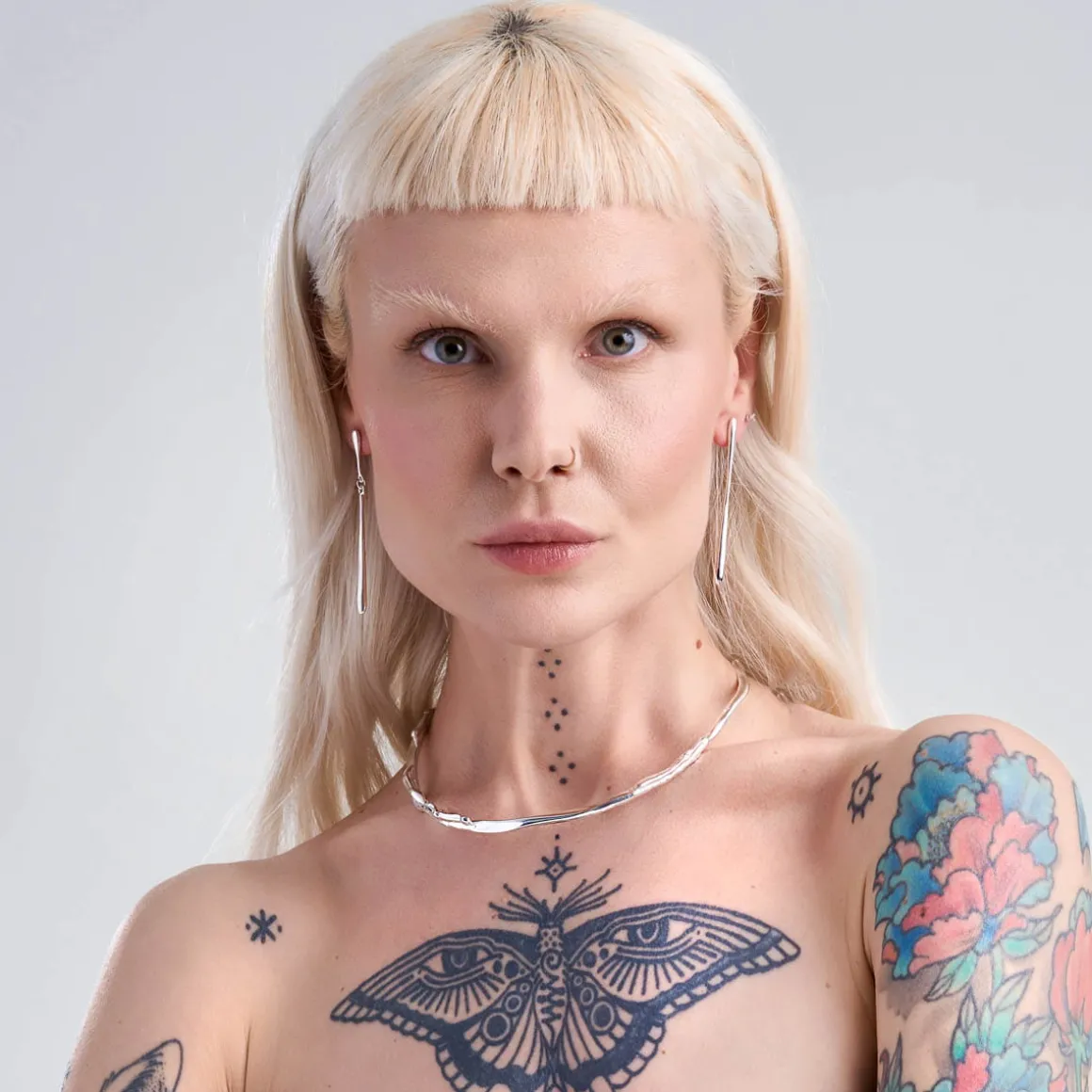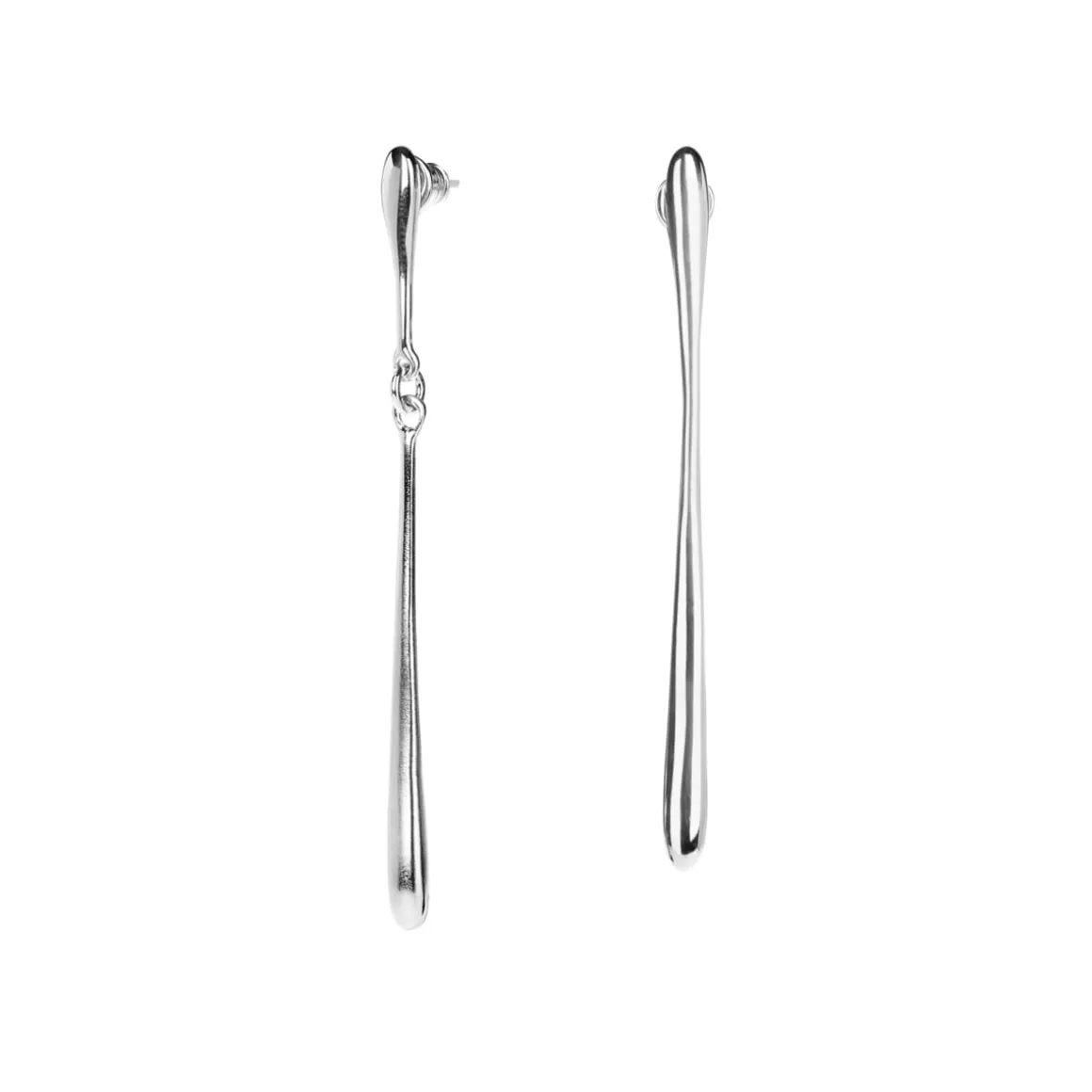 Asymetryczna para kolczyków wygląda jakby została wykonana z podłużnych kropli płynnego metalu. Pierwszy, dłuższy z pary, został stworzony z dwóch połączonych ze sobą elementów w kształcie łezek. Drugi jest krótszy i złożony z jednego, długiego elementu. Kolczyki zostały stworzone z jasnego srebra o wysokim połysku, które pasuje do wszystkich typów urody, a w formie długich kolczyków rozświetla twarz. Srebrne kolczyki są uniwersalne i ponadczasowe, ale lubią też kreatywne połączenia. Zestaw je ze złotym naszyjnikiem lub bransoletką i uwierz w siłę kontrastów!