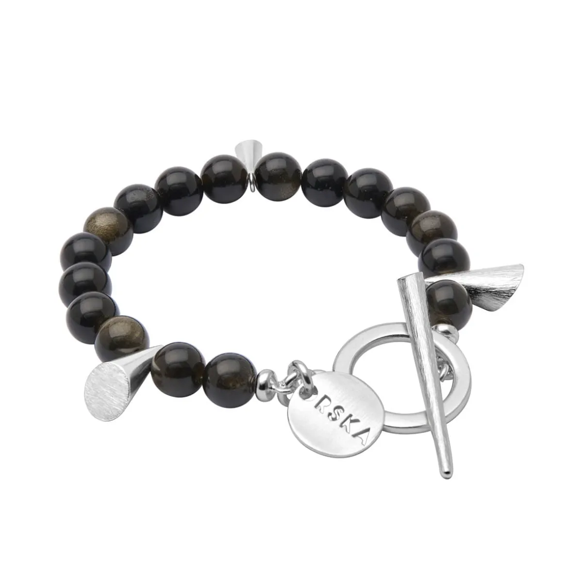 Bransoletka została ręcznie wykonana z obsydianu szlifowanego na kształt lśniących kuleczek. Obsydian ma głęboki czarny kolor, ale miejscami połyskują w nim złote inkluzje, które tworzą efekt przypominający rozgwieżdżone nocne niebo. Bransoletę zdobią geometryczne zawieszki w formie ostrosłupów ze srebra próby 925. Srebrnym zawieszkom częściowo nadano satynowe wykończenie, gdzieniegdzie przeplatając je z ręcznie szczotkowanym metalem o drapanej fakturze. Ta gra faktur charakterystyczna dla kolekcji Guatemala, sprawia, że poszczególne elementy bransolety w różny sposób odbija światło. Zapięcie na skobel wykonano ze srebra uformowanego na kształt smukłego stożka o szczotkowanej powierzchni, która dodaje całości surowego, oryginalnego wykończenia. Do zapięcia bransoletki przytwierdzono dodatkowo zawieszkę z logiem ORSKA.
