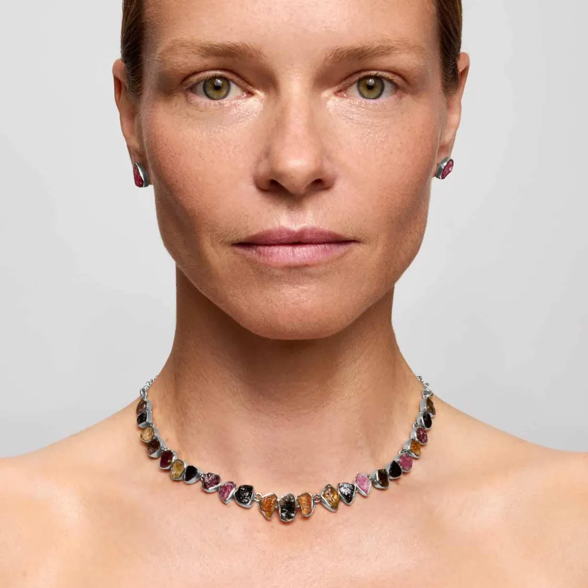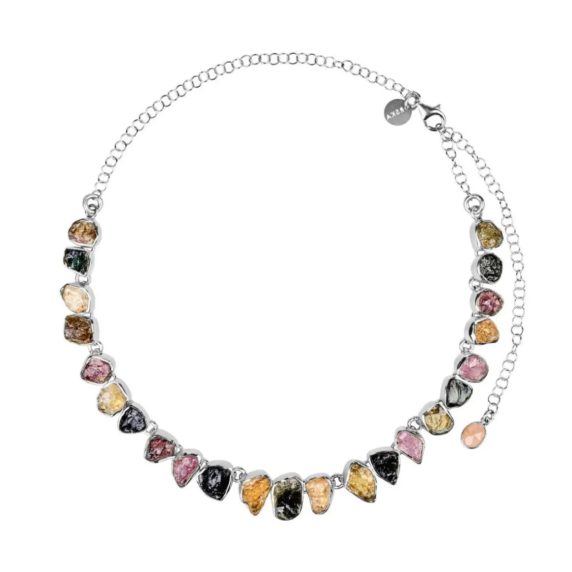Kolia została stworzona z wielobarwnych turmalinów ułożonych w świetlisty pas, przypominających zorze polarne rozpięte na nocnym niebie. Kamienie użyte w tej wyjątkowej mozaice pochodzą z Radżastanu, gdzie zostały obrobione w niewielkim, rodzinnym warsztacie jubilerskim. Anna Orska poznała jego właścicieli podczas jednej ze swoich projektowych podróży do Indii. Turmaliny nie były szlifowane, lecz łupane – dzięki temu zachowały pierwotny charakter, surową fakturę i nieregularne formy. Każdy z nich został indywidualnie oprawiony w srebro, co podkreśla ich asymetryczne kształty i naturalne piękno. To podejście wyróżnia kolekcję, gdyż w jubilerstwie zwykle stosuje się powtarzalne, ustandaryzowane oprawy. Kolia zakończona jest regulowaną przedłużką z zawieszką w formie logo ORSKA, która pozwala dopasować jej długość.