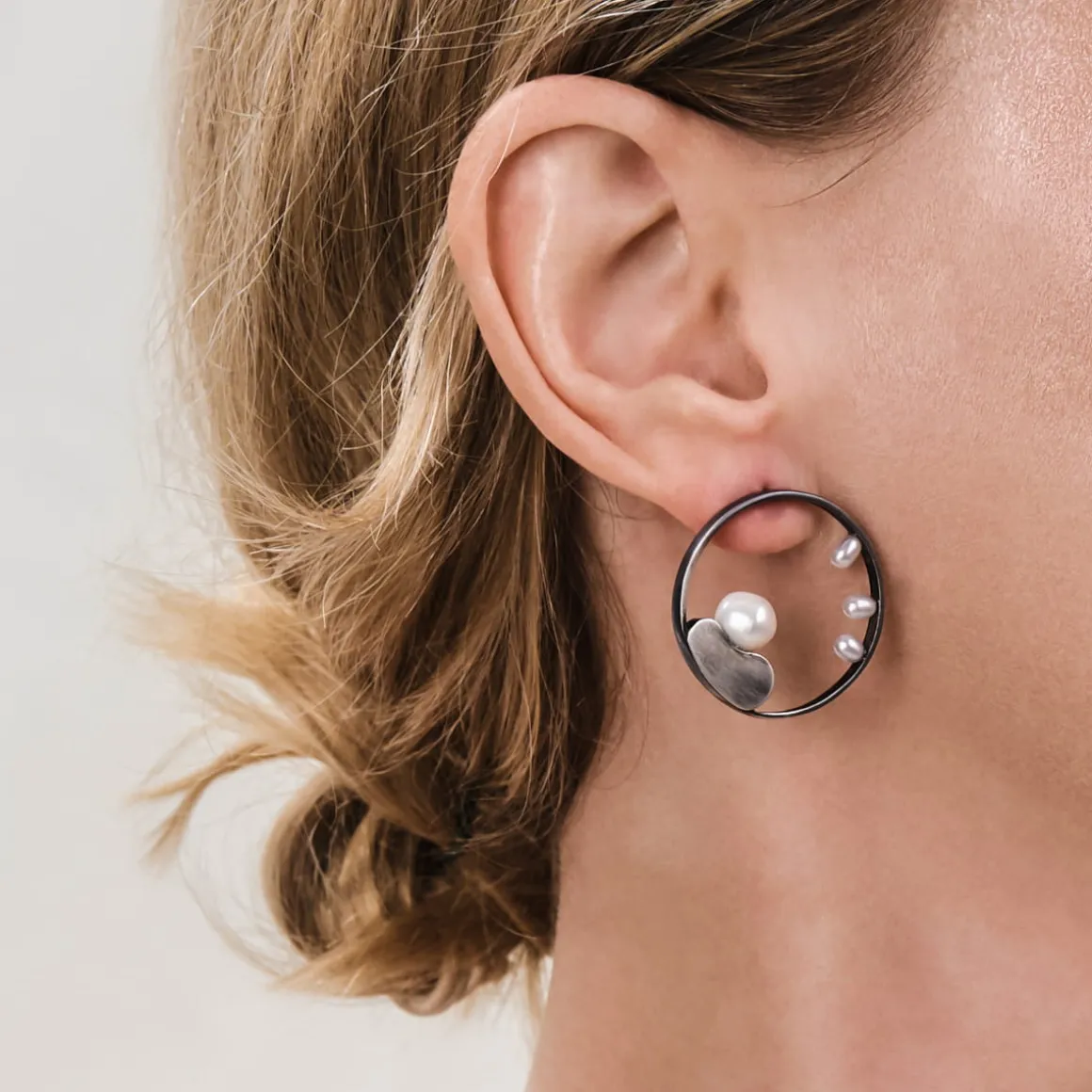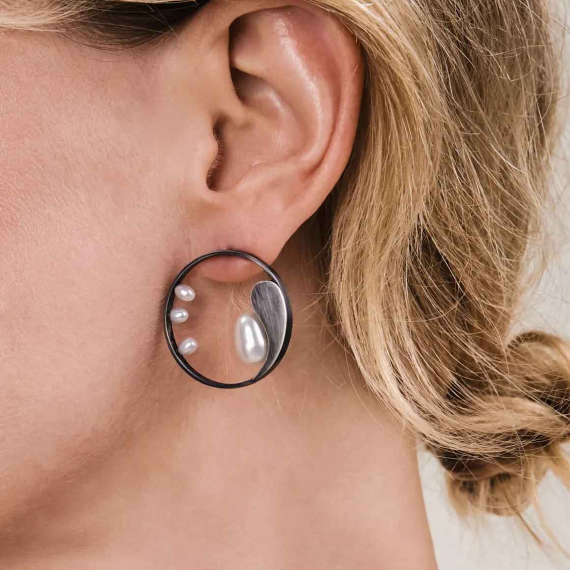 Asymetryczne kolczyki zostały wykonane ręcznie. W klasyczne koła wpisano miękkie, nieregularne kształty odlane w srebrze, które ozdobione zostały perłami słodkowodnymi. Całość utworzyła elegancką kompozycję, przypominającą zdobne ornamenty art nouveau. Kolczyki, mimo dekoracyjnej formy, mają elegancki charakter. Pięknie prezentują się solo, ale lubią być w komplecie! Docenią towarzystwo naszyjnika z dużymi perłami i czarno-białej bransoletki z onyksem.