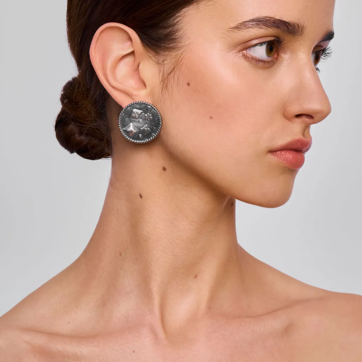 Kolczyki w kształcie medalionów to świetna baza do stworzenia wielu stylizacji zarówno codziennych, jak i bardziej odświętnych. Dobrze wyglądają solo, ale jeszcze lepiej prezentują się w duecie z amuletnicą na sznurze lśniących labradorytów. Śmiało łącz kolczyki z biżuterią z innych kolekcji: subtelną obrączką z lapisem lazuli z kolekcji Orini, która doda odrobiny koloru lub oksydowanym naszyjnikiem z meteorytem Aletai. Stylizację dopełni pin w kształcie oka z kolekcji Semios. A na specjalne okazje dobrym towarzyszem dla kolczyków, będzie okazały srebrny naszyjnik w kształcie medalionu.