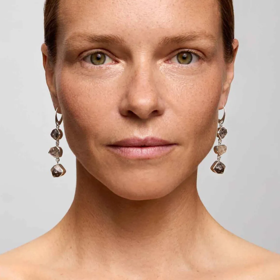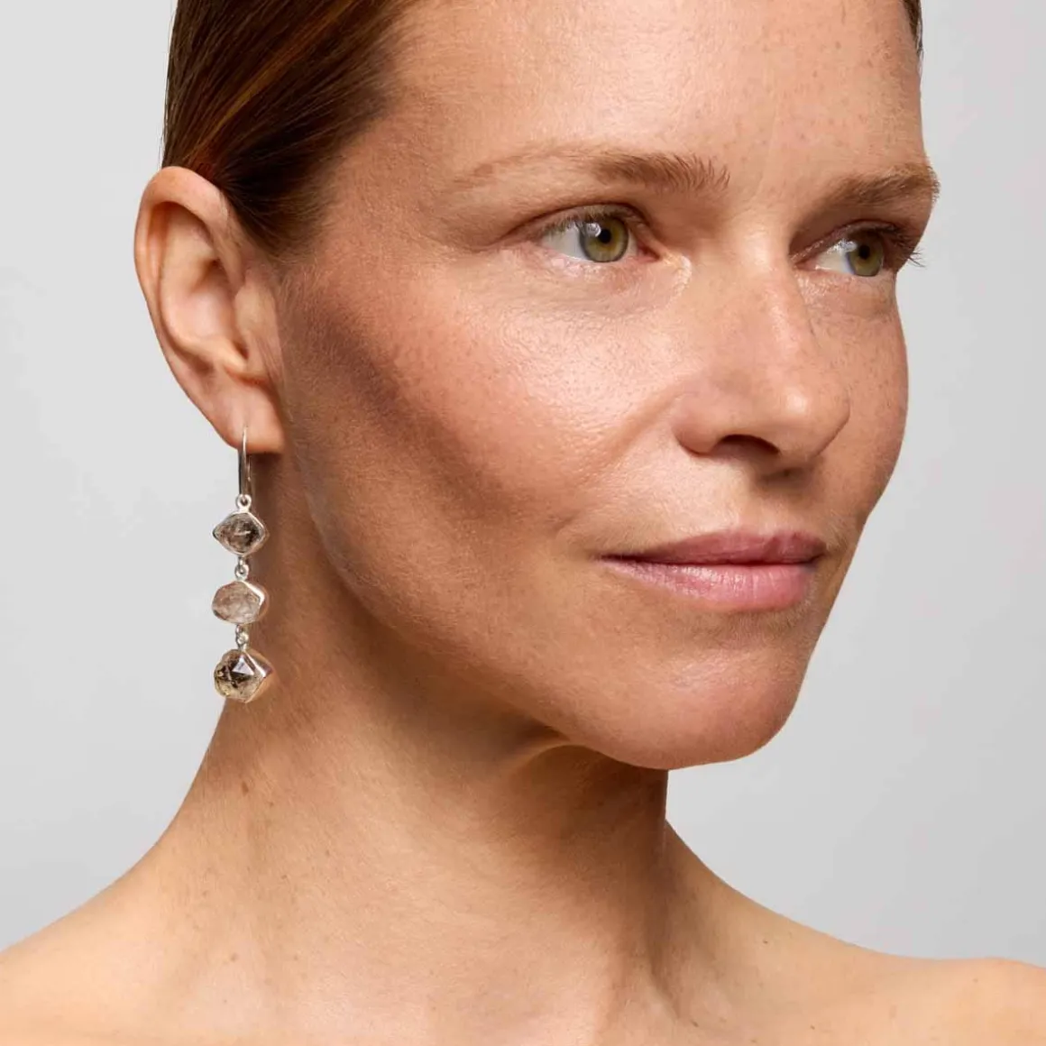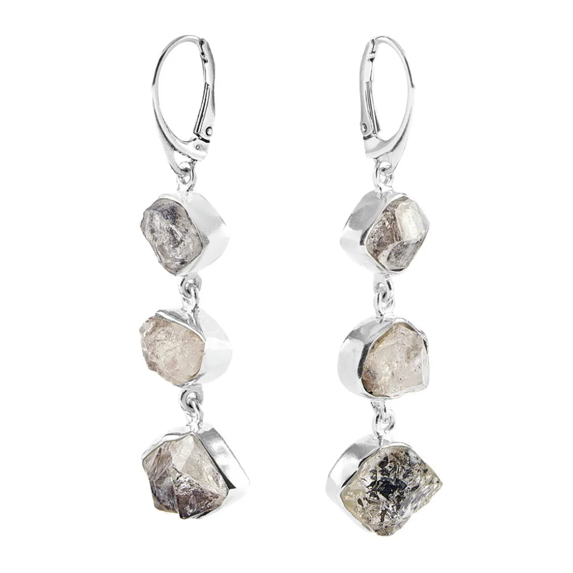 Wiszące kolczyki na zapięciu typu bigiel angielski zostały wykonane ze srebra próby 925 i naturalnych kamieni: herkimerów. Ten kryształ górski o transparentnej barwie zachwyca surową strukturą, nieregularną formą i barwnymi inkluzjami, które dodają mu charakteru. Kamienne bryłki zostały indywidualnie oprawione w srebro, by podkreślić nieregularny, pierwotny kształt kamienia. To wyjątkowe podejście wyróżnia kolekcję, bo w jubilerstwie zazwyczaj stosuje się ustandaryzowane oprawki. Każdy kolczyk tworzą trzy kamienie zawieszone jeden pod drugim. Herkimery delikatnie różnią się wielkością, kształtem i fakturą, dlatego każda para kolczyków jest unikatowa.