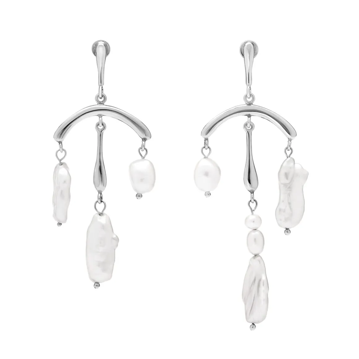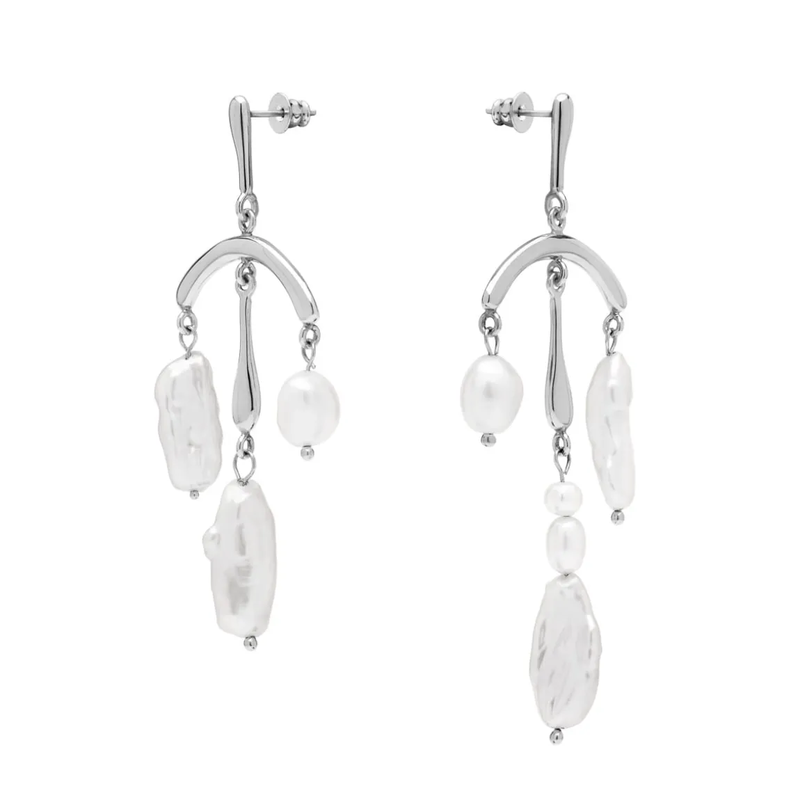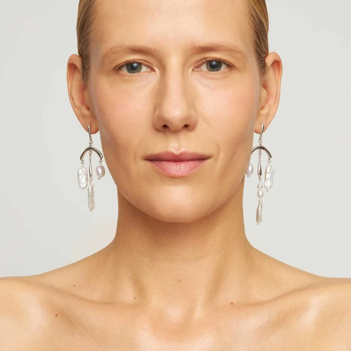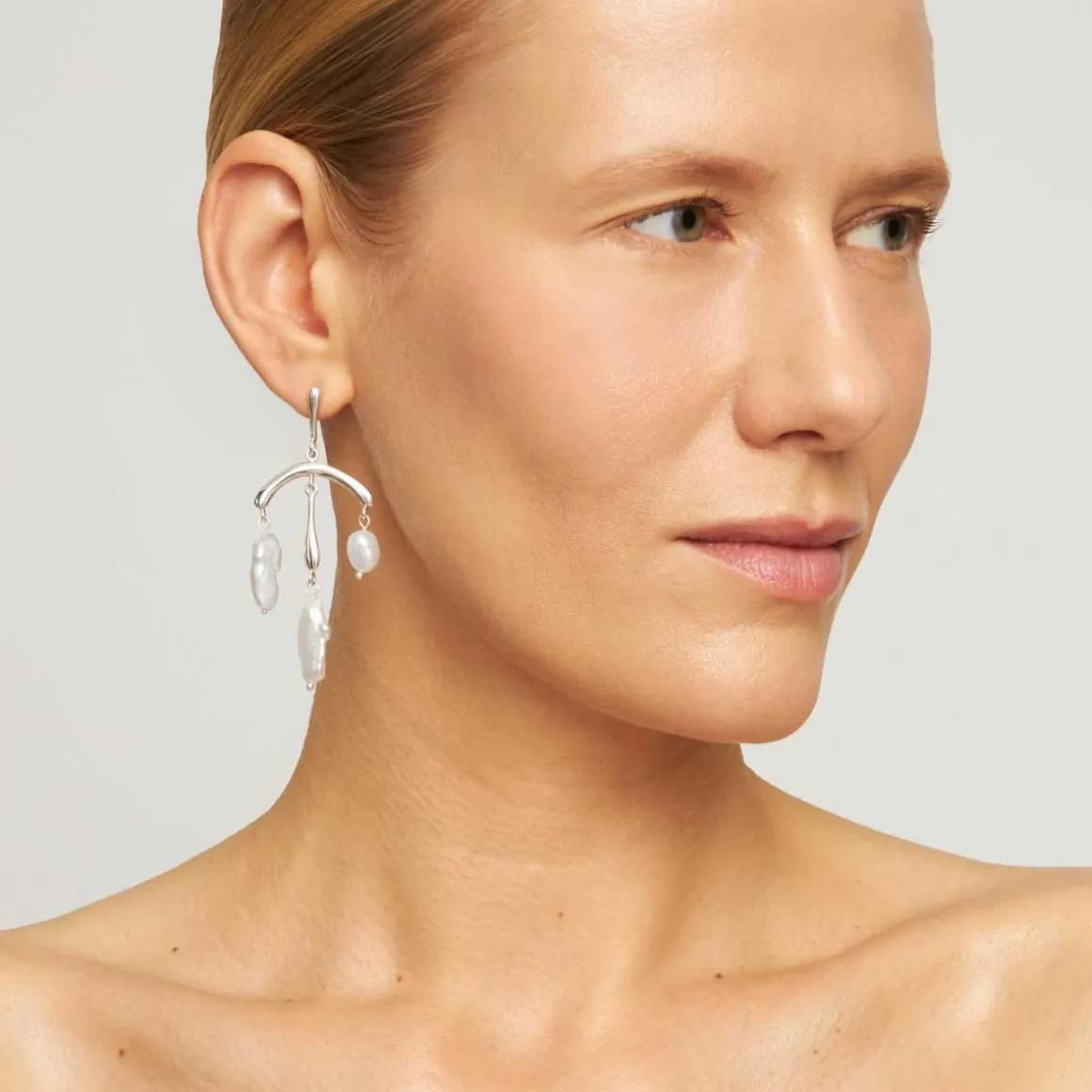 Wiszące kolczyki zostały wykonane z jasnego srebra próby 925. Zapinane są na wygodny sztyft przymocowany do srebrnego elementu przypominającego odwróconą kroplę. Do tej formy dodano srebrny łuk z perłowymi zawieszkami, tworząc efektowną i dynamiczną kompozycję. Kolczyki są asymetryczne. W jednym z nich znajdują się trzy zawieszki: na skrajach dwie z nieregularnymi, podłużnymi perłami, a w centrum zawieszka ze srebrną kroplą i perłą. W drugim kolczyku skrajne zawieszki to pojedyncze perły, natomiast środkowa to srebrna kropla zakończona trzema nieregularnymi perłami. Konstrukcja kolczyków przywodzi na myśl łapacze snów i estetykę boho. Perły delikatnie poruszają się przy każdym kroku, subtelnie migocząc i przyciągając spojrzenia.