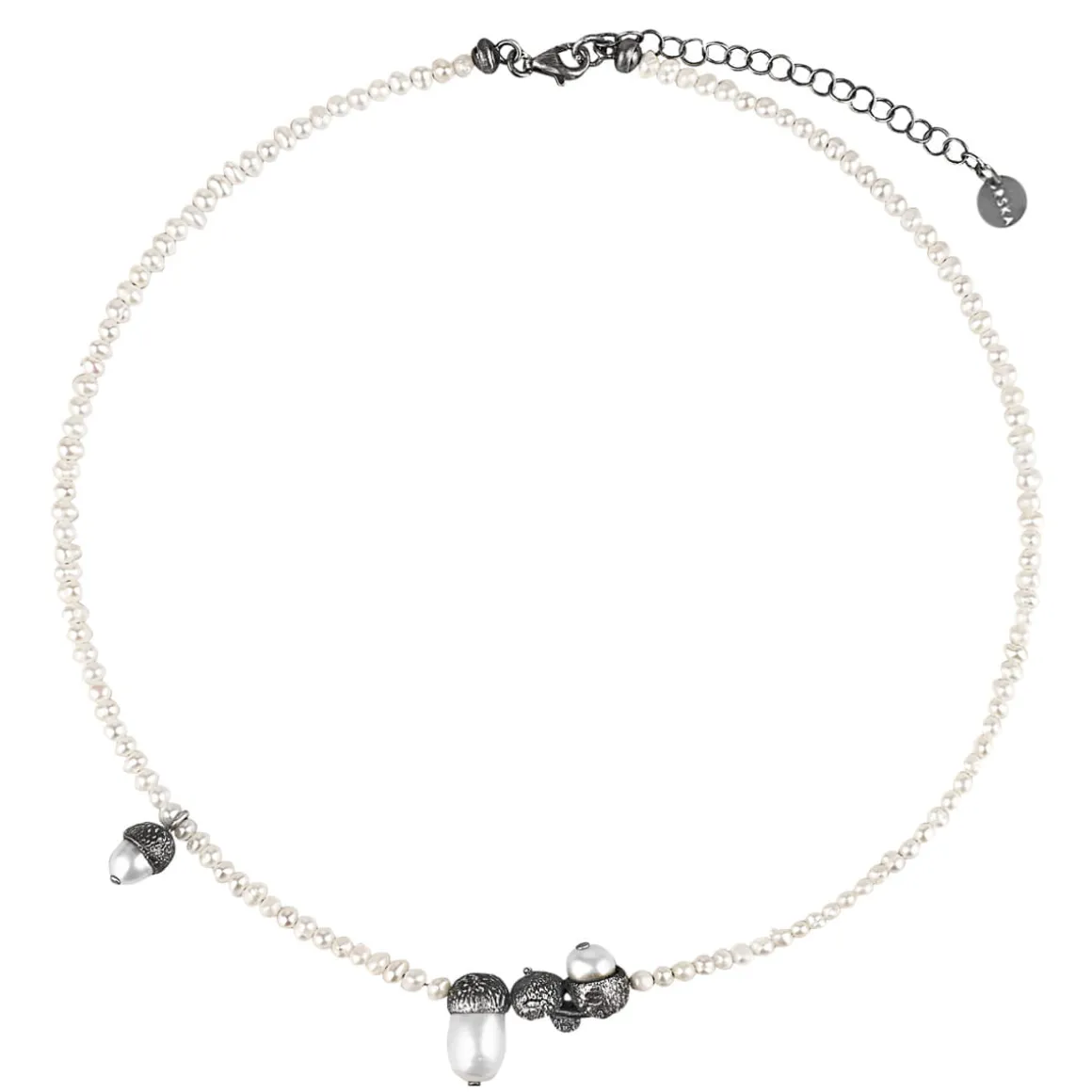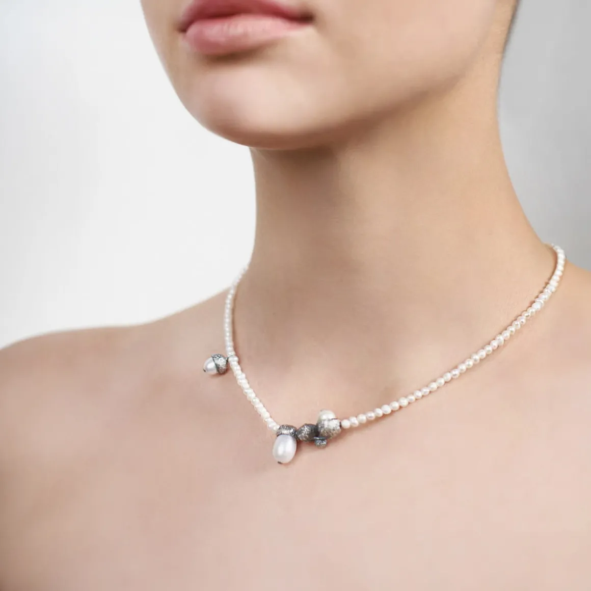Sznur drobnych, nieregularnych pereł o kremowym odcieniu, zdobią niesymetryczne zawieszki. W srebrnych skorupkach żołędzi osadzono naturalne perły, tworząc oryginalne orzechy dębu. Całość uzupełnia małe logo ORSKA, kilkucentymetrowa przedłużka i zapięcie na karabińczyk w grafitowym kolorze. Elegancki naszyjnik z kolekcji Bery pasuje zarówno do białej koszuli jak i wieczorowej kreacji. Jednak, na przekór konwenansom, warto zestawić go również ze sportowym t-shirtem, aby dodać stylizacji odrobiny blasku. Naszyjnik, razem z długimi lub krótkimi kolczykami na sztyft, utworzy duet, któremu nie oprze się nawet specjalna okazja.