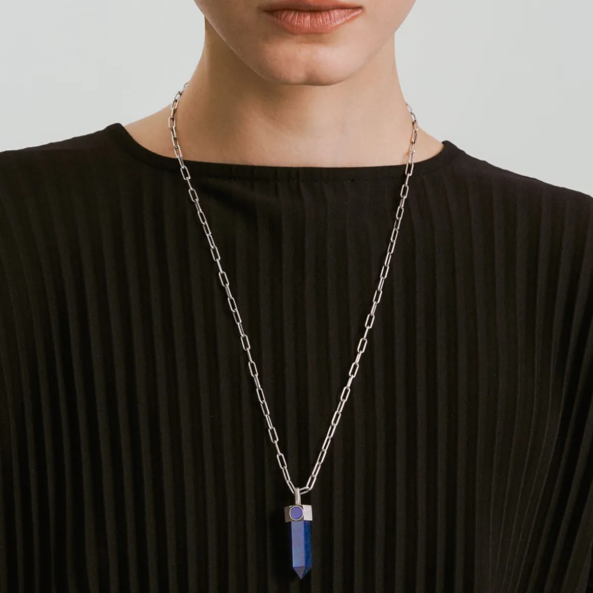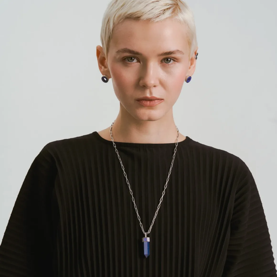 Naszyjnik został wykonany z oksydowanego srebra w naszej jubilerskiej pracowni. Biżuteria przyciąga uwagę swoją geometryczną formą oraz intensywnie niebieskim kamieniem lapis lazuli w kształcie smukłego kryształu, który zdobi długi, wyrazisty łańcuch. Zawieszkę uzupełnia elegancka, srebrna oprawa o gładkim, satynowym wykończeniu, z centralnie umieszczonym lapis lazuli w klasycznym, okrągłym kształcie. Łańcuch z dużymi ogniwami nadaje naszyjnikowi wyrazisty, industrialny charakter, czyniąc go idealnym dodatkiem do nowoczesnych, miejskich stylizacji. Dzięki możliwości regulacji długości, zapięcie można dopasować do dowolnej wysokości, co zapewnia wygodę w codziennym noszeniu. Całość dopełnia zapięcie na karabińczyk oraz logo ORSKA, podkreślające unikalność projektu. Naszyjnik świetnie komponuje się z innymi elementami kolekcji Orini, takimi jak srebrne kolczyki w kształcie pierścienia lub niebanalny sygnet z lapis lazuli, pozwalając stworzyć spójną i wyrazistą całość.