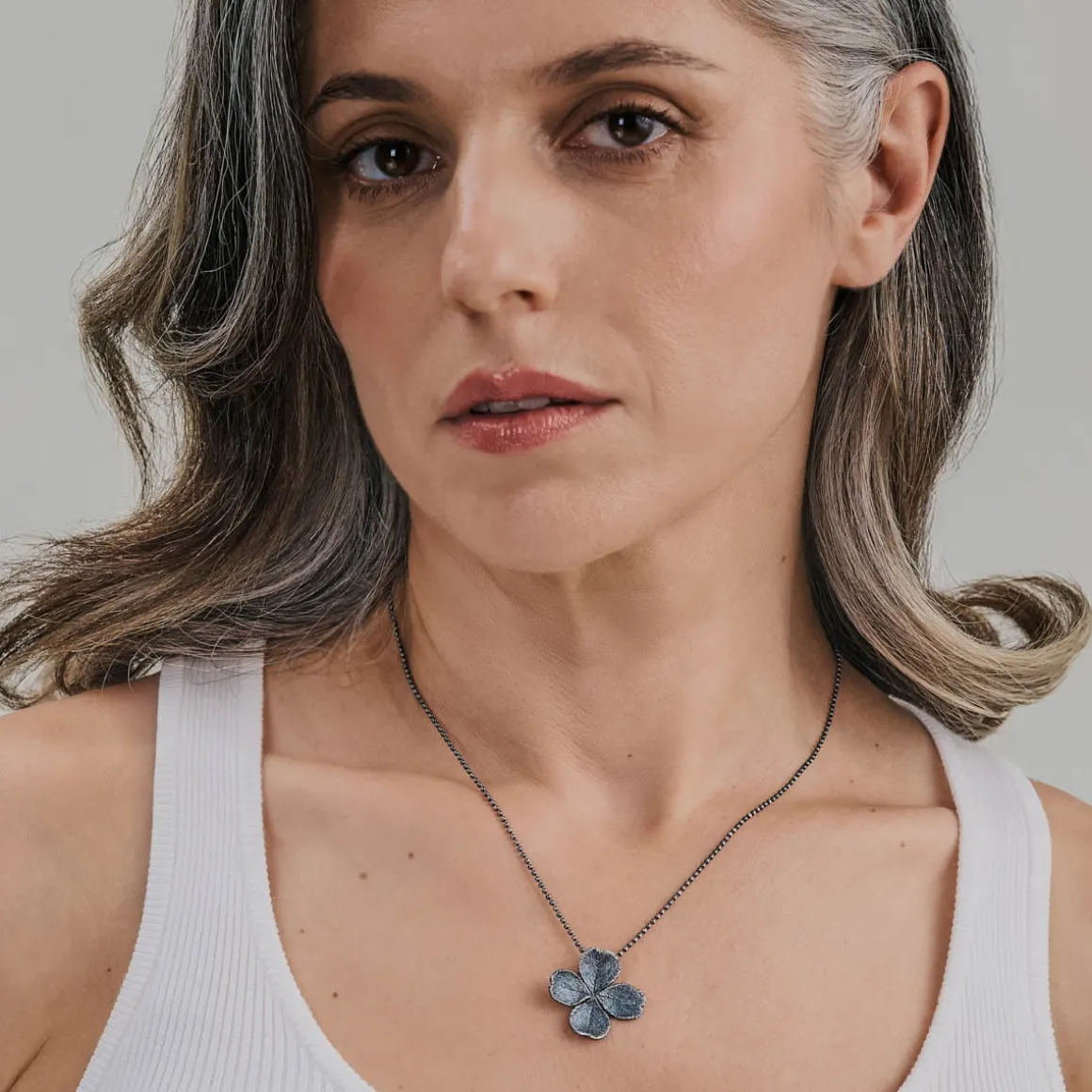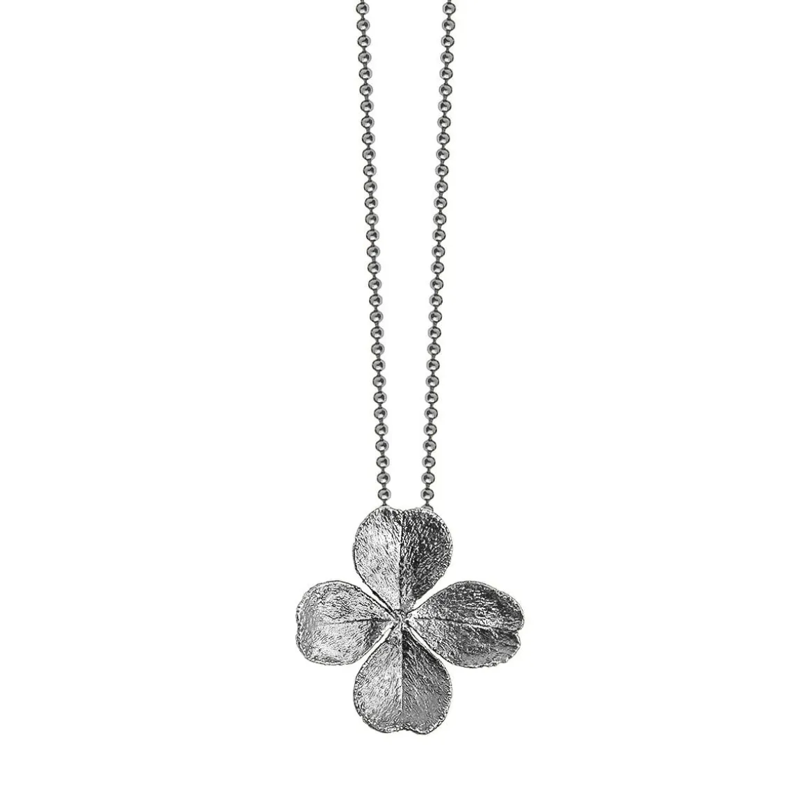 Krótki naszyjnik z delikatną zawieszką w kształcie czterolistnej koniczyny został wykonany ręcznie ze srebra. Każdy listek tej niezwykłej rośliny niesie inne dobrodziejstwo – wiarę, nadzieję, miłość i szczęście. Wierzenia w jej dobroczynną moc są uniwersalne na całym świecie. Przyczyny ich popularności można doszukiwać się w równie uniwersalnym pragnieniu szczęścia i miłości. Z tego powodu oryginalna biżuteria będzie idealnym podarunkiem dla życzliwej osoby. Naszyjnik ma subtelną, klasyczną formę. Prosty i lekki design łańcuszka czyni go doskonałym dodatkiem na co dzień.