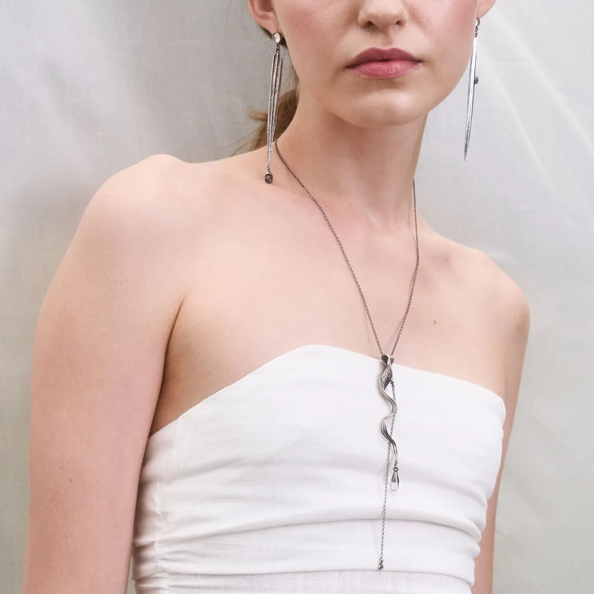 Naszyjnik wykonaliśmy ręcznie w pracowni ORSKA ze srebra. Łańcuszek o drobnych oczkach ozdobiliśmy okazałą zawieszką w kształcie pofalowanego źdźbła trawy. Dzięki starannie odwzorowanym detalom wisior ma naturalny, organiczny wygląd. Zawieszka ozdobiona została kryształem górskim w formie kropli. Idealnie transparentny kwarc wygląda jak krople rosy, który zraszają łąkę o poranku. Naszyjnik tworzy także krótki łańcuszek podwieszony z przodu i zakończony okrągłym kryształem. Srebrny naszyjnik poddaliśmy oksydacji, dzięki czemu ma elegancki, ciemny kolor, która uwypukla naturalną strukturę liści trawy.