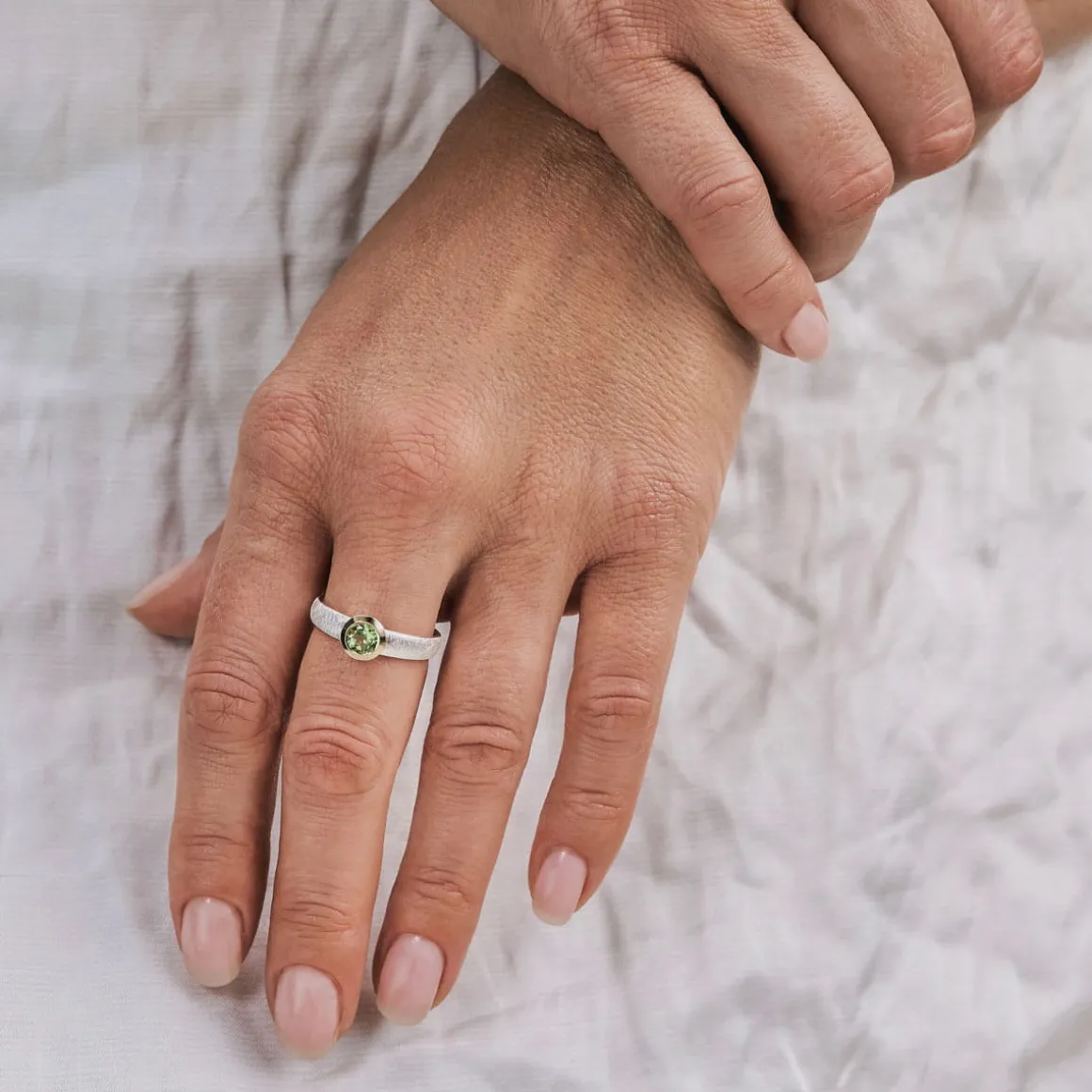 Pierścionek został wykonany ręcznie. Srebrną, szeroką obrączkę o szczotkowanej powierzchni ozdobiono pozłacaną koroną, w której umieszczono fasetowany perydot. Połączenie koloru złotego i srebrnego sprawia, że pierścionki doskonale sprawdzą się w zestawieniu z biżuterią w obu tych kolorach. Sam kamień został precyzyjnie oszlifowany, dlatego zachwyca blaskiem i pięknie kontrastuje z surowym srebrem. Obrączka od wewnętrznej strony jest gładka, dzięki czemu będzie wygodna w użytkowaniu. Pierścionek pasuje zarówno do codziennych jak i wieczorowych stylizacji. Z diamentowym naszyjnikiem lub bransoletką stworzą duet, który przyciągnie spojrzenia. W zakładce rozmiary znajdziesz wskazówki, jak wybrać właściwy rozmiar pierścionka.