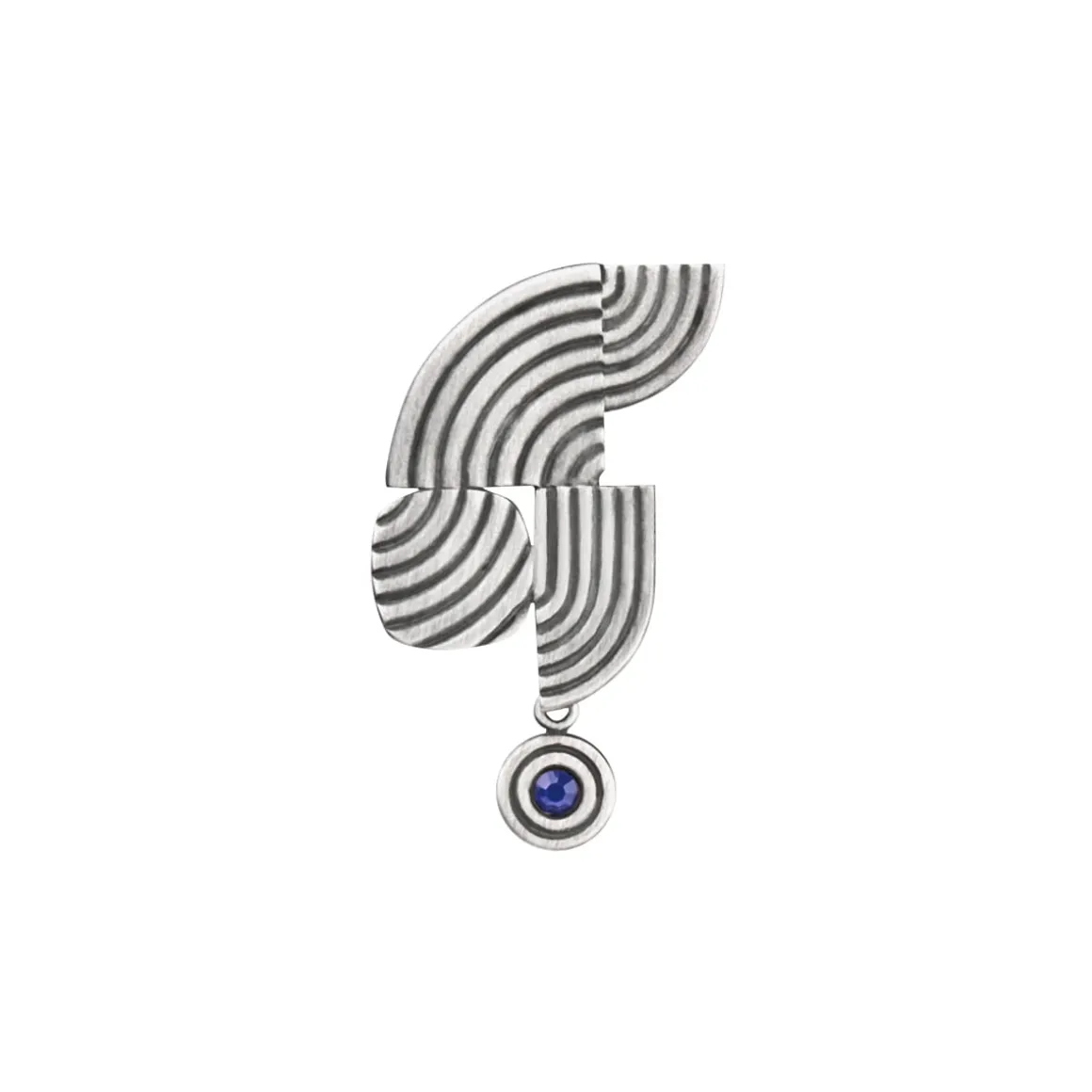 Ludzkie życie zaczyna się i kończy na oddechu. W niektórych miejscach wierzy się, że dusza wchodzi w człowieka wraz z pierwszym oddechem. W naturze powietrze towarzyszy nam w sposób namacalny w postaci wiatru. Jest symbolem kreatywności i uważności. W pracowni ORSKA przełożyliśmy moc żywiołu powietrza na elegancką przypinkę. Pin z kolekcji Holos został odlany ze srebra, a następnie oksydowany. Ten zabieg nadał mu oryginalny, grafitowy kolor. Cztery jego części zostały złożone ze srebrnych pręcików. Dynamiczne linie zmieniają kierunek naśladując kształtem nieustannie pędzący łuk powietrza. Kompozycję uzupełnia kryształ o błękitnej barwie.