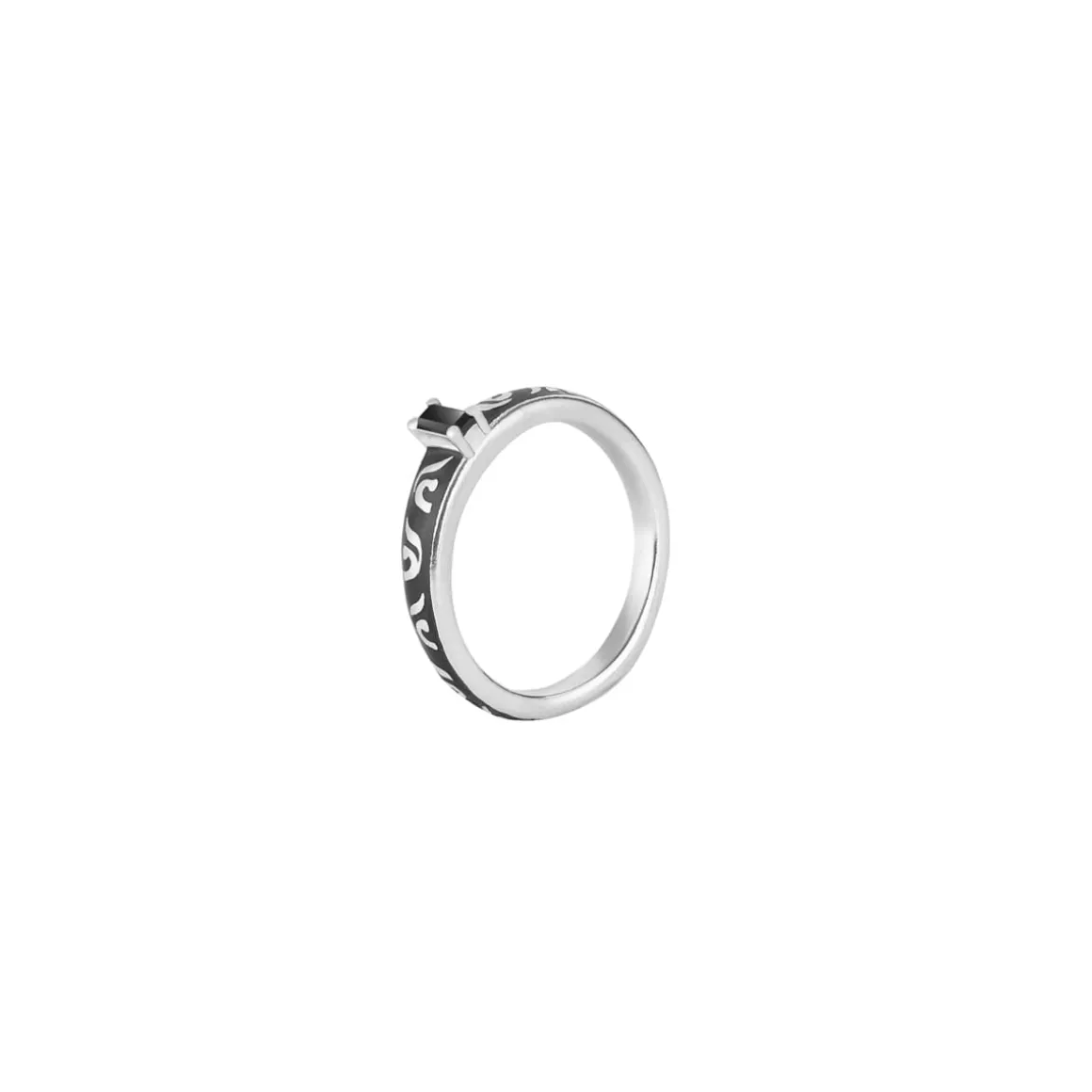 Srebrny pierścionek został stworzony z cienkiej, delikatnej obrączki, w której centrum umieszczono prostokątne, fasetowane kundan glass w głębokim, czarnym odcieniu. Tradycyjnie szlifowane indyjskie szkło oprawiono w srebrną koronę, która subtelnie podkreśla jego geometryczną formę i elegancki charakter. Obrączkę zdobią emaliowane ornamenty w postaci oplatających ją pnączy – motywu silnie zakorzenionego w kulturze indyjskiej i perskiej. Pnącza symbolizują ciągłość, więzi oraz trwałość. Ich splatające się linie są metaforą relacji, które rozwijają się i umacniają mimo zmiennych okoliczności.