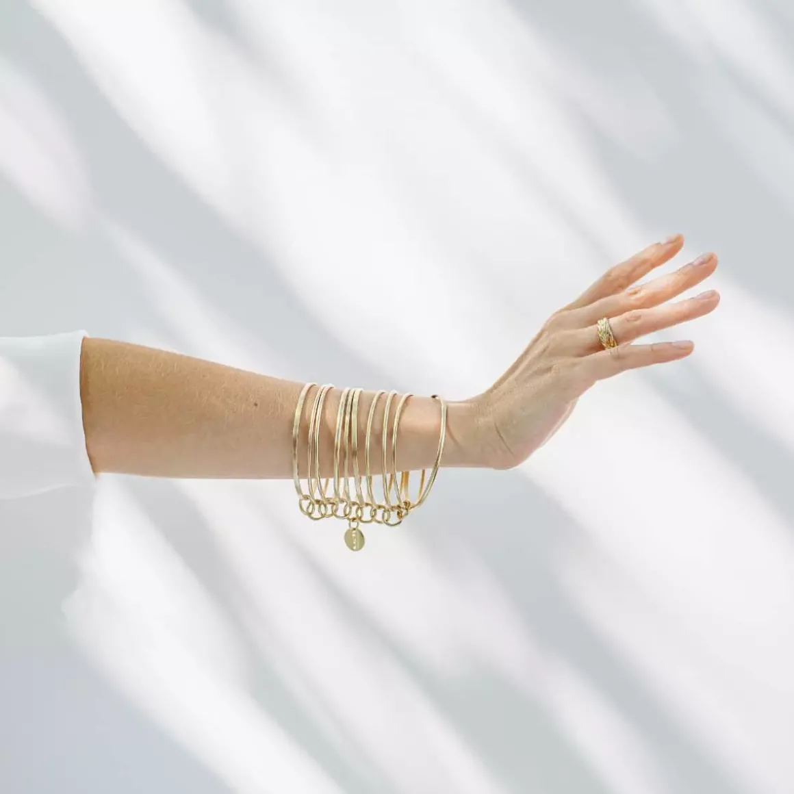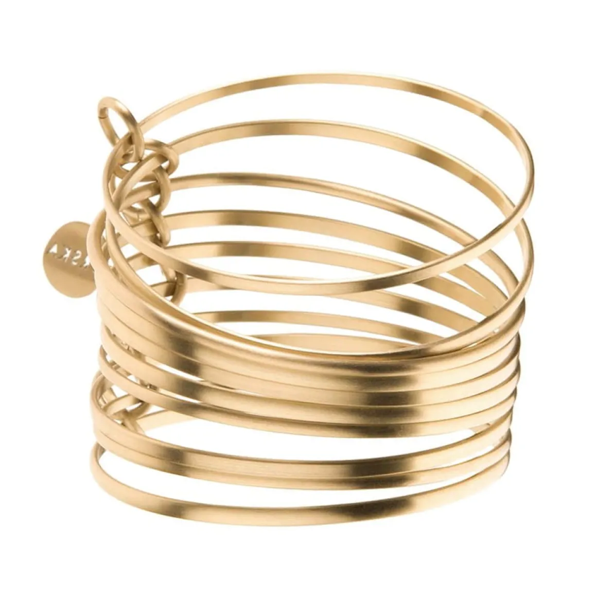 Artystyczna bransoletka z kolekcji Vintage została wykonana ręcznie z pozłacanego mosiądzu. Dziesięć kół o satynowej powierzchni zostało połączonych w jedną całość z pomocą ogniw. Industrialną biżuterię zdobi podwieszone logo ORSKA. Klasyczna, okrągła bransoletka w multiplikowanej, bogatej wersji zyskuje świeży, nowoczesny rys. Efektowny dodatek przyciąga spojrzenia i skupia na sobie całą uwagę.