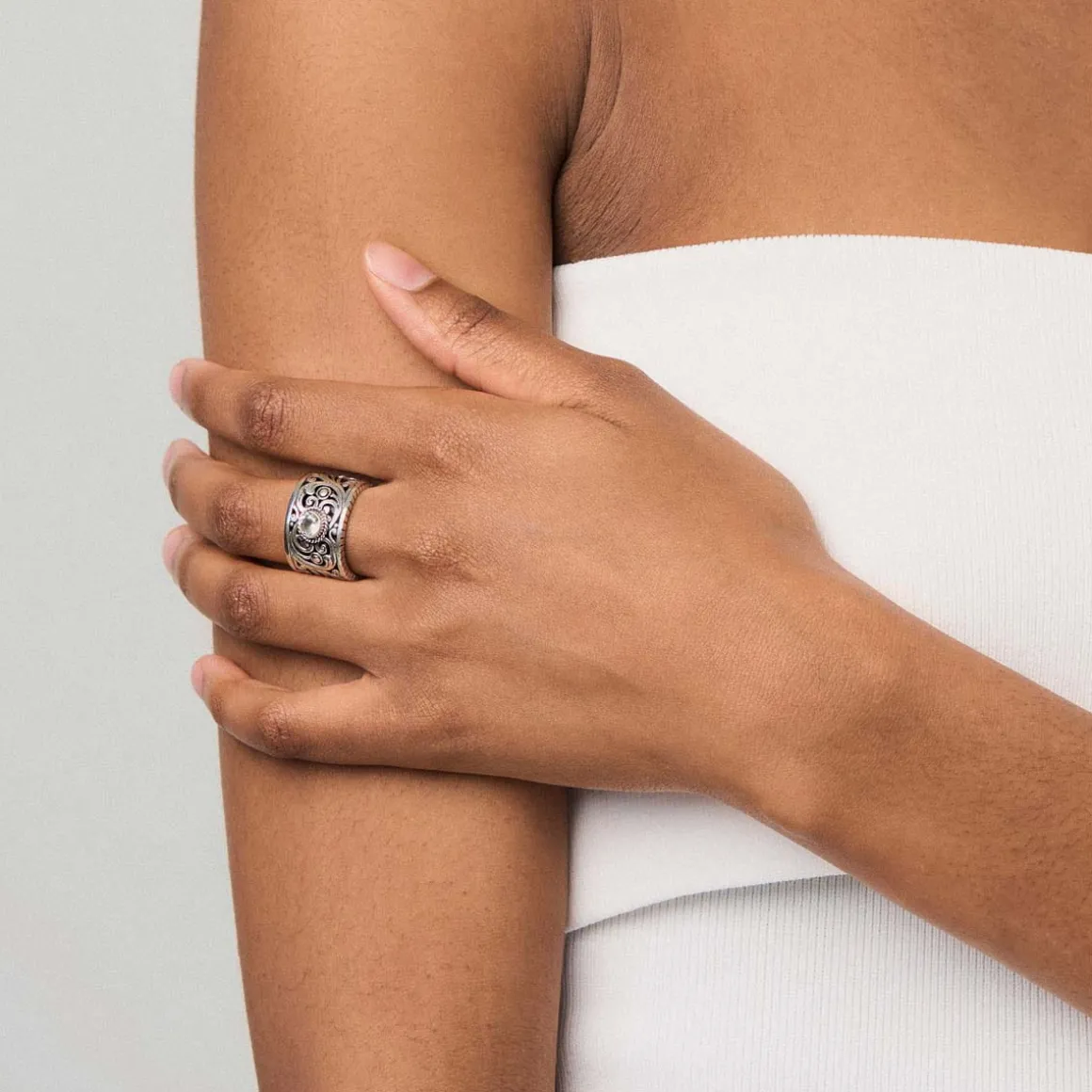 Szeroka obrączka została wykonana ręcznie ze srebra próby 925. Pierścionek został bogato ozdobiony floralnym wzorem o lekkiej, ażurowej konstrukcji. Pierścionek zdobi duże oczko. Zielony, fasetowany ametyst oprawiony został w srebrną spiralną koronę. Zielony ametyst jest kamieniem, który tradycyjnie kojarzony jest z energią i odnową. Przypisuje się mu właściwości harmonizujące i stabilizujące. Uważa się, że może wspierać kreatywność, odwagę do podejmowania decyzji oraz pomagać w kształtowaniu nowych, pozytywnych nawyków.
