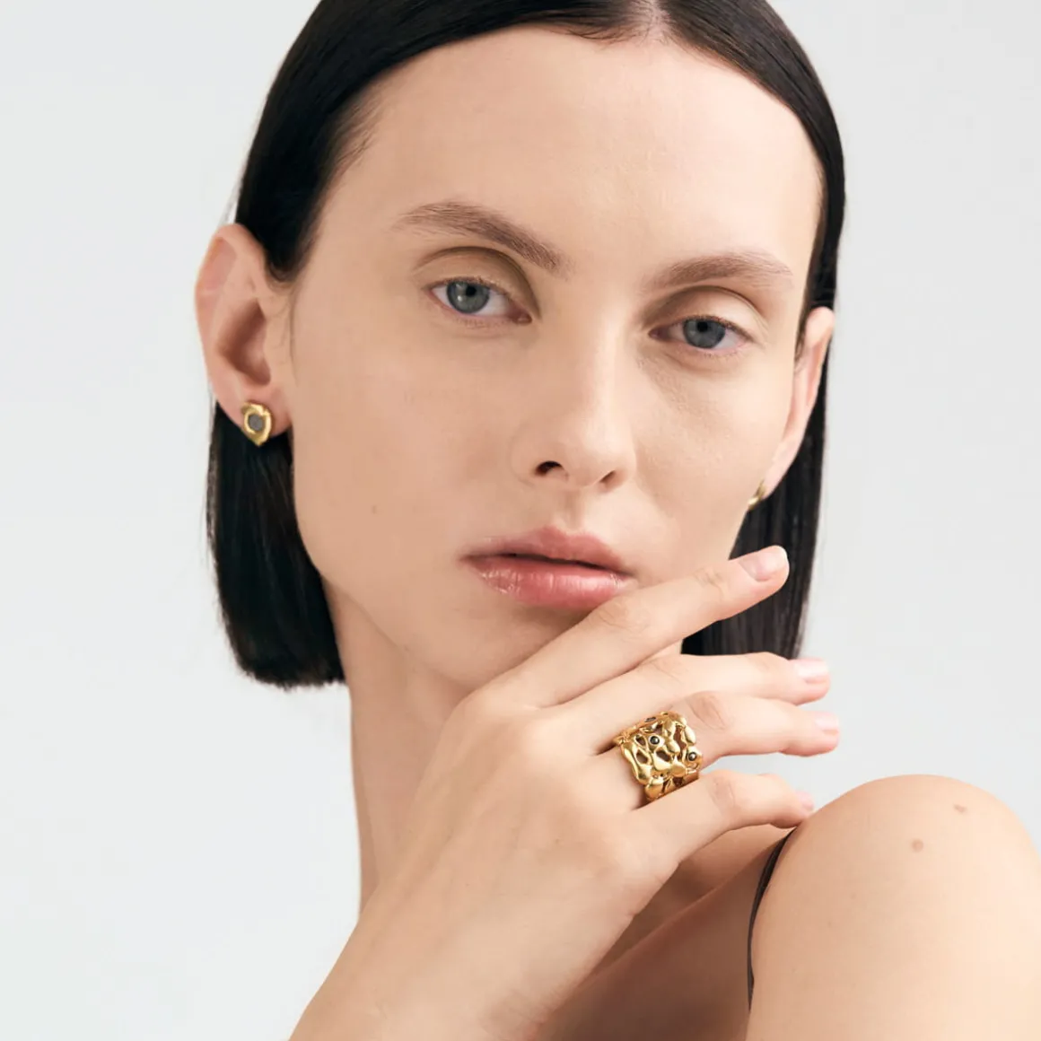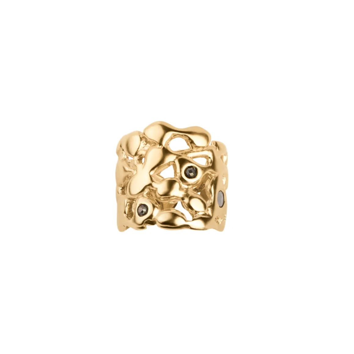 Szeroka obrączka z kolekcji Meteoros zachwyca swoją organiczną formą, która przywodzi na myśl nieregularne powierzchnie ciał niebieskich przemierzających kosmos. Została wykonana ręcznie z pozłacanego mosiądzu. Jej otwarta, ażurowa konstrukcja tworzy efekt falujących i nieregularnych kształtów, które sprawiają wrażenie wyrzeźbionych przez kosmiczne kolizje. Obrączka została ozdobiona meteorytem Aletai, którego srebrno-szara barwa subtelnie kontrastuje z ciepłym złotem oprawy. Pierścionek zdobią także fasetowane piryty, które w towarzystwie kosmicznych cząstek znalazły się nieprzypadkowo. Niektórzy wierzą, że piryty wspierają siłę woli i determinację. Te dwa „kamienie” idealnie się więc uzupełniają. Spadające gwiazdy zachęcają do marzenia, a piryty pomagają zamienić marzenia w rzeczywistość.