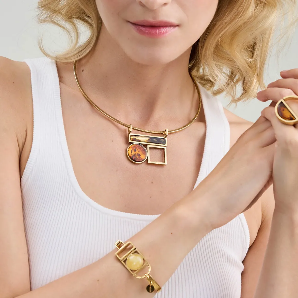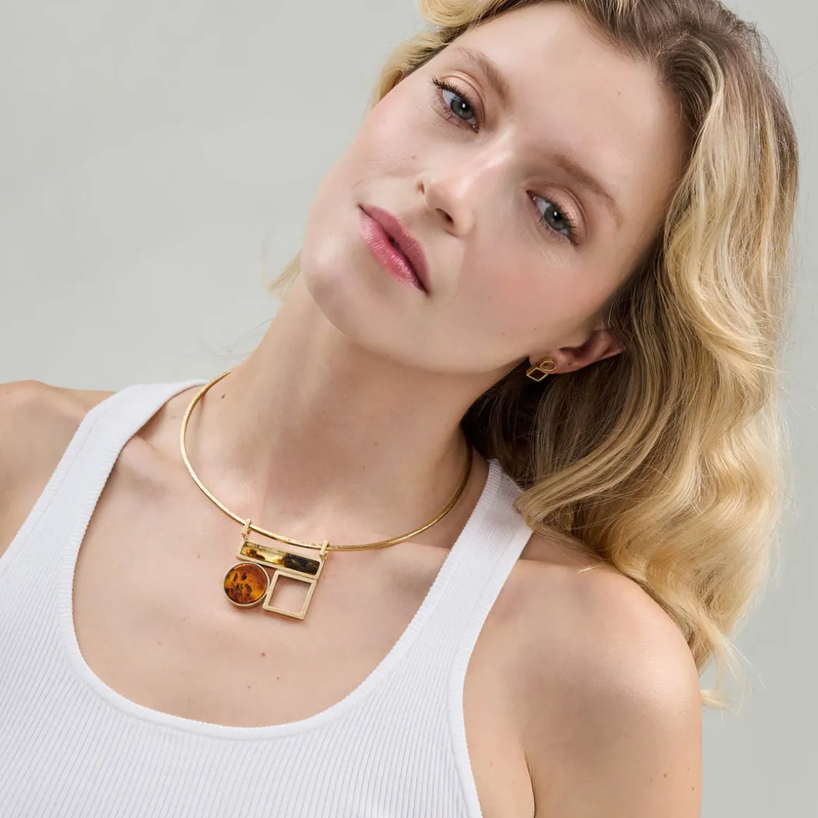 Efektowną kolię wykonaliśmy ręcznie z pozłacanego mosiądzu oraz naturalnych bursztynów. Sztywną obręcz o kutej powierzchni ozdobiliśmy geometryczną zawieszką. Prostokątny i okrągły bursztyn wpisaliśmy w mosiężne formy o pozłacanym satynowym wykończeniu, dodatkowo łącząc je z ażurowym kwadratem, który całości dodał lekkości. Naszyjnik posiada zapięcie na karabińczyk oraz krótki łańcuszek – przedłużkę z ogniw, pozwalającą na regulację długości, na końcu której znajduje się logo ORSKA. Spod okrągłego bursztynu niczym naturalna inkluzja przeziera subtelny, roślinny grawer.