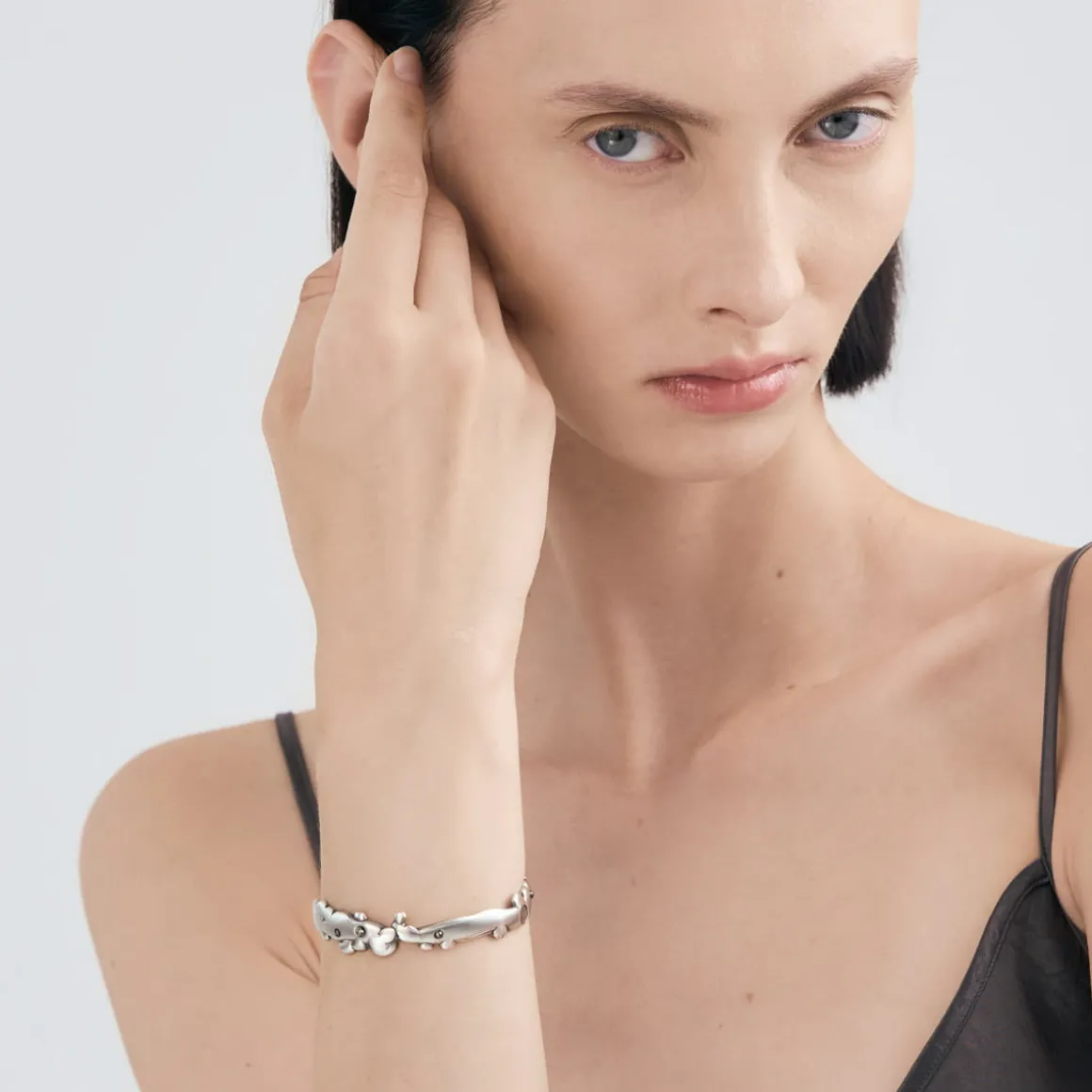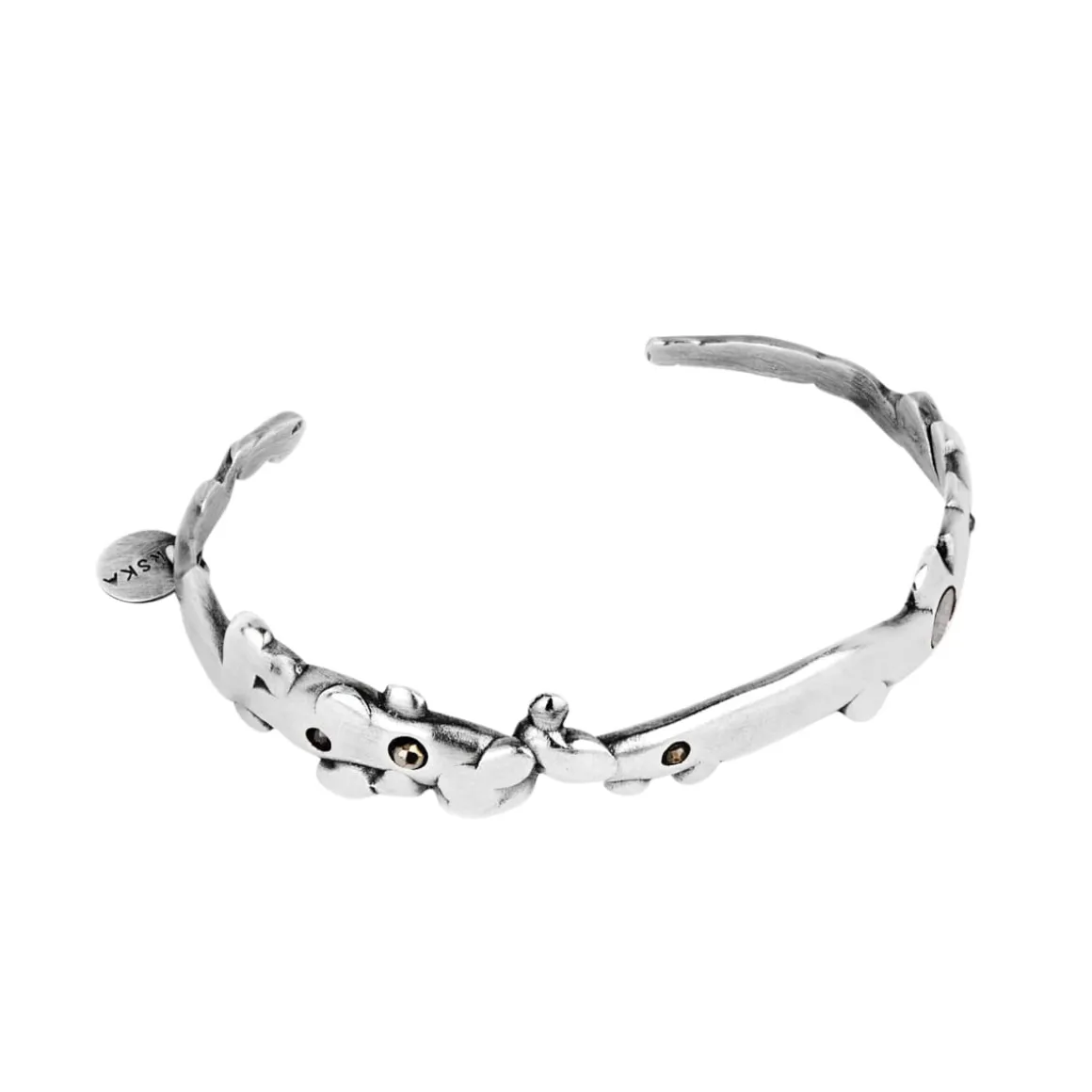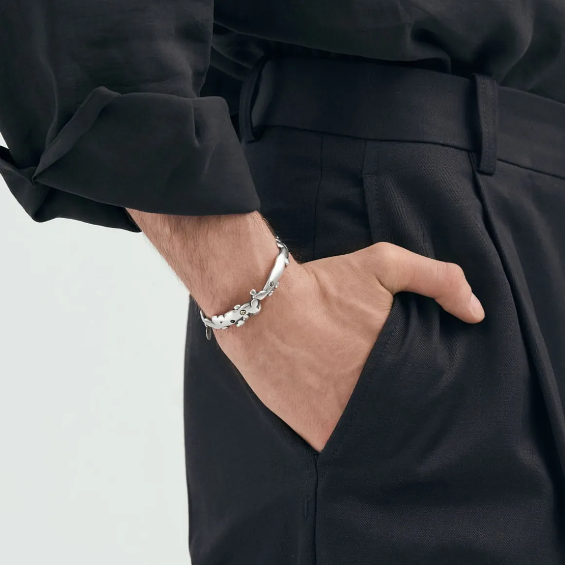 Ręcznie wykonana ze srebra próby 925 bransoletka z kolekcji Meteoros emanuje kosmicznym pięknem, łącząc w sobie artystyczny kunszt z najstarszym surowcem na naszej Planecie – meteorytem. Sztywna obręcz, zdobiona nieregularnymi formami powstałymi metodą lanego metalu, subtelnie owija się wokół nadgarstka, przywodząc na myśl kosmiczne kształty. Ozdobiona fragmentami meteorytu Aletai oraz pirytami, bransoletka zyskuje wyjątkowy, nieziemski charakter. Zawieszka z logo ORSKA subtelnie zamyka całą kompozycję. Bransoletka nie ma zapięcia, dzięki temu można ją łatwo wsunąć na nadgarstek.