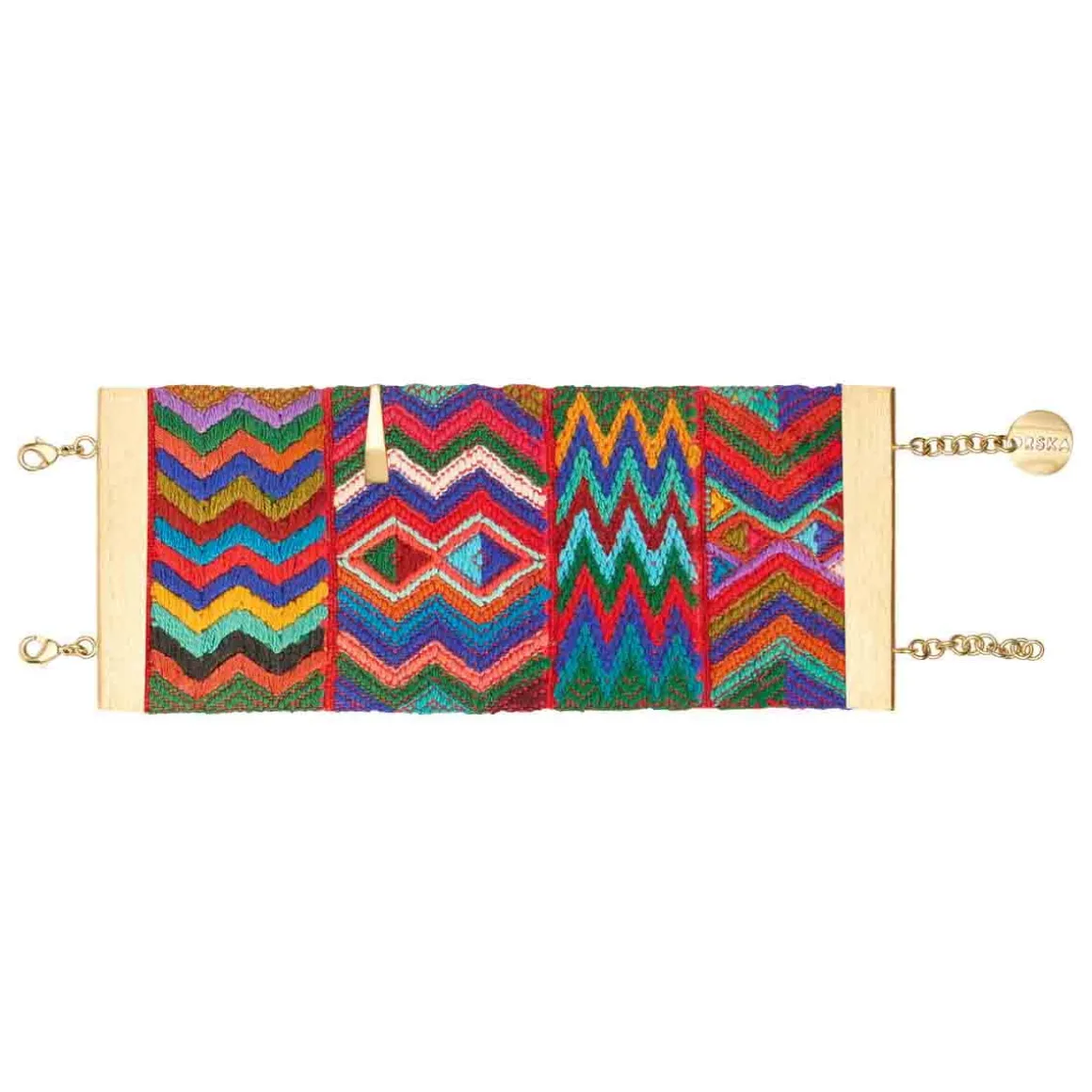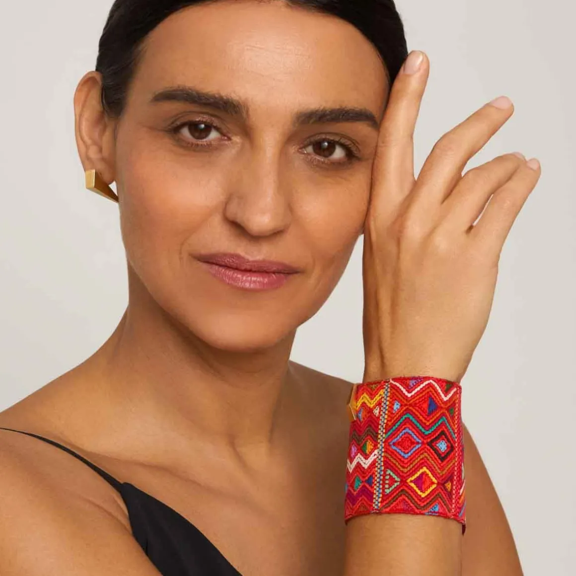 Bransoletka powstała z szerokiego pasma ręcznie tkanej gwatemalskiej tkaniny, która tworzy efektowny materiałowy mankiet na nadgarstku. Wielobarwne wzory, zostały oprawione w pozłacane, mosiężne ramy z charakterystycznym, szczotkowanym wykończeniem – ich drapana faktura kontrastuje z miękkością materiału. Bransoletka zapinana jest na dwa klasyczne karabińczyki z możliwością regulacji długości dzięki przedłużkom, z których jedna ozdobiona jest firmowym logiem. Do tkaniny przymocowano ozdobny mosiężny element w formie ostrosłupa, który nawiązuje kształtem do stożkowych jadeitów z reszty kolekcji, spajając wszystkie elementy tej kolekcji w spójną opowieść.