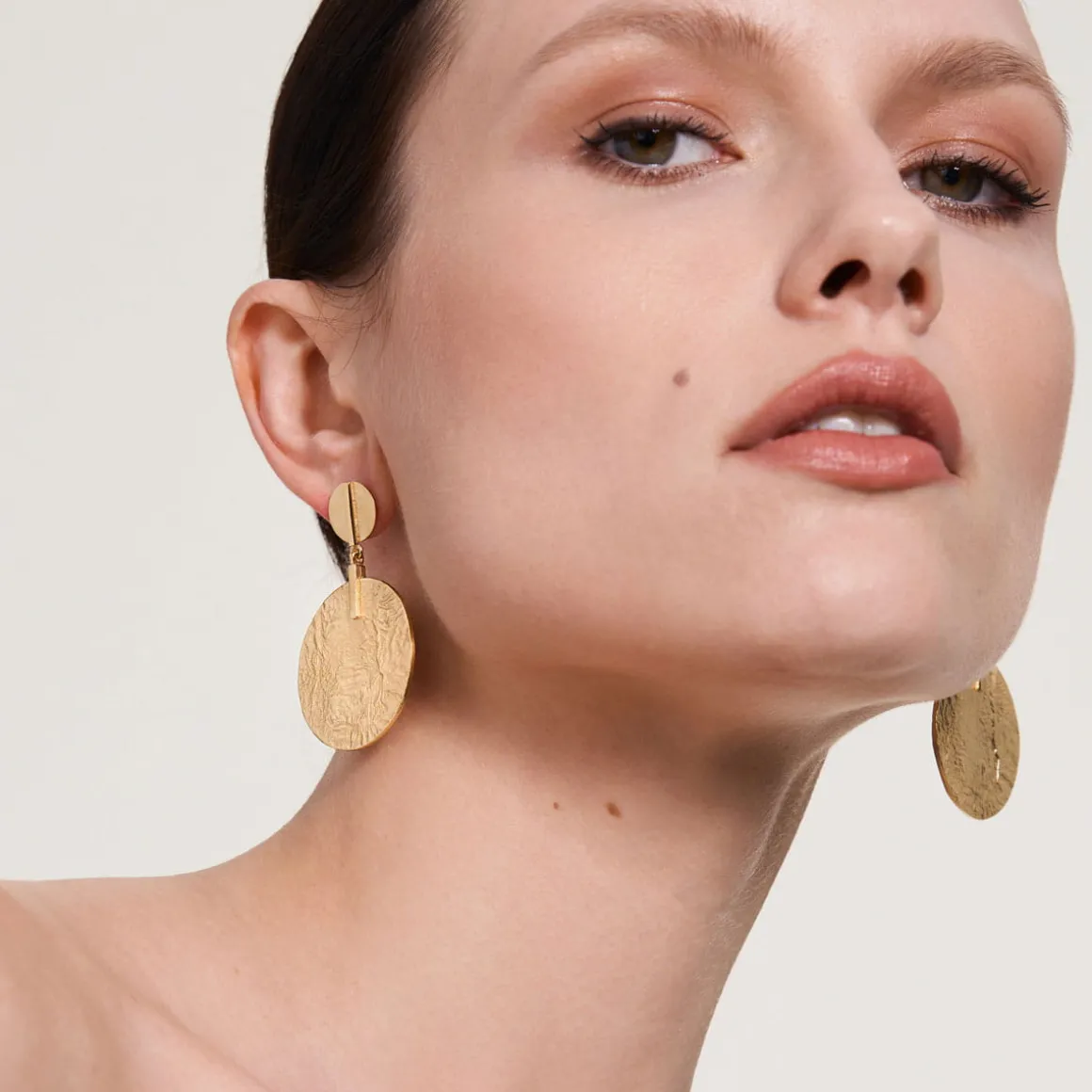 Artystyczne kolczyki na sztyfcie z kolekcji Moon zostały ręcznie wykonane z pozłacanego mosiądzu mosiądzu. Owalne płaszczyzny, pod wpływem wysokiej temperatury, przyjęły niepowtarzalną strukturę zagięć, która przywodzi na myśl krajobraz księżycowy. Powierzchnia wiszących kolczyków posiada satynowe wykończenie. Nowoczesnego sznytu dodają im proste, podłużne elementy wykończone na wysoki połysk. Oryginalny design najlepiej prezentuje się w towarzystwie innych wzorów z tej samej kolekcji. Pozostaje więc tylko wybrać wielkość konstelacji, aby stworzyć własny Układ Słoneczny.