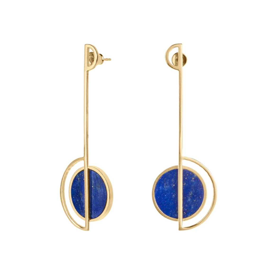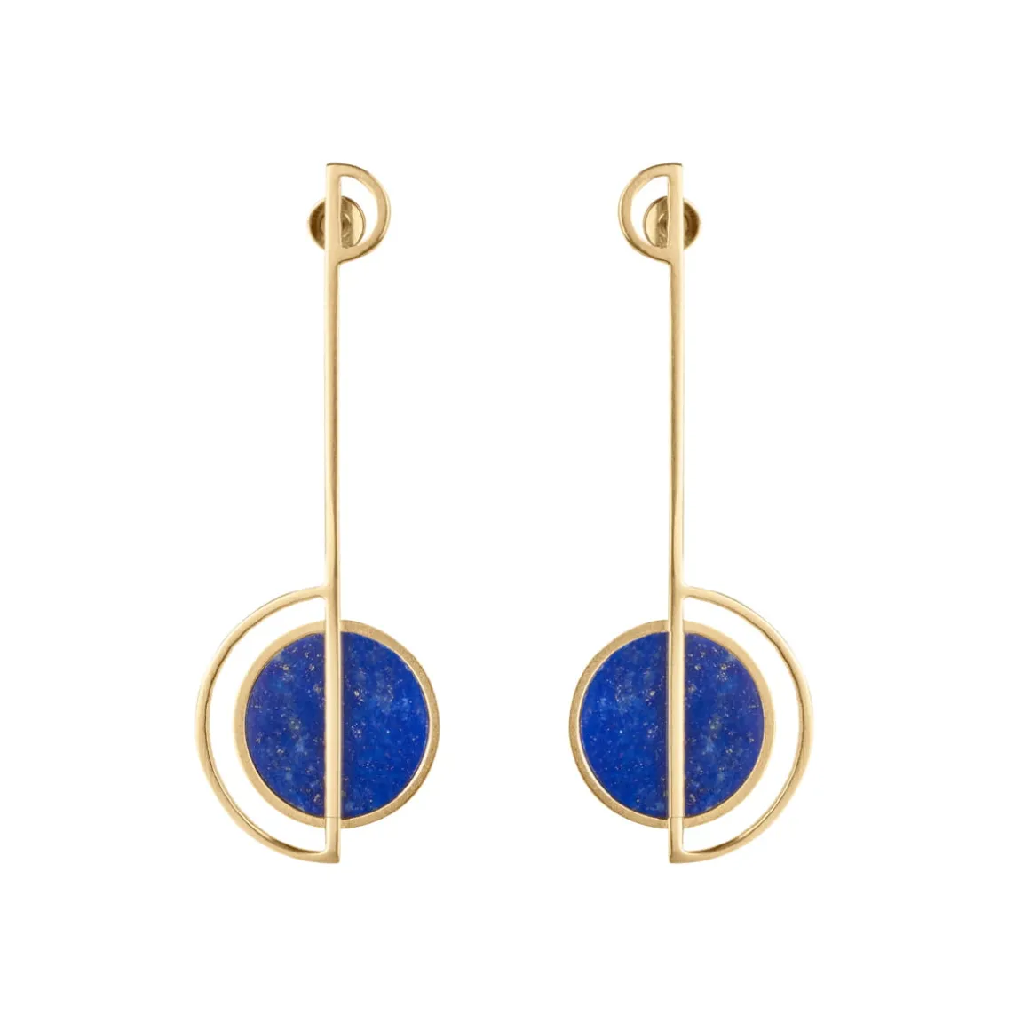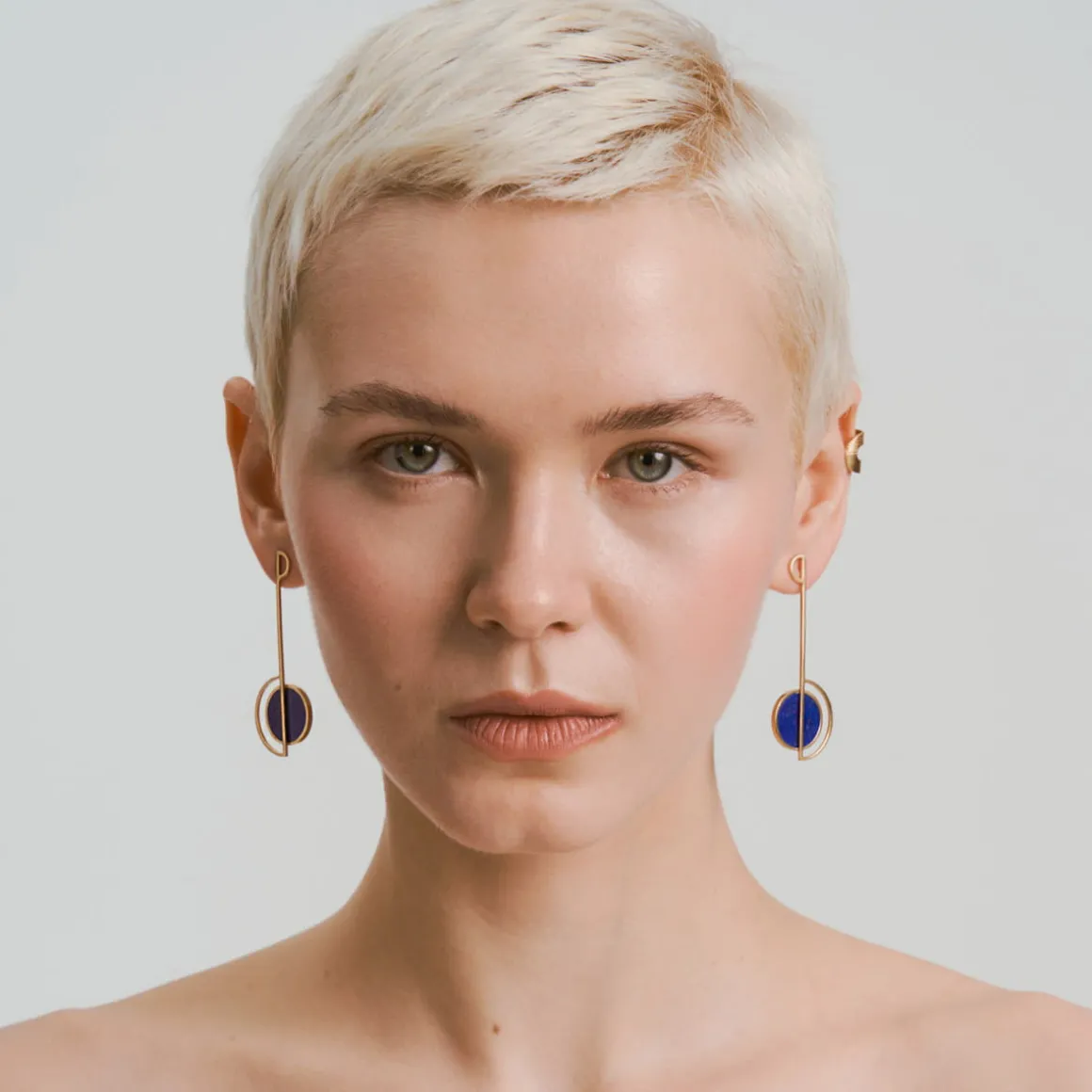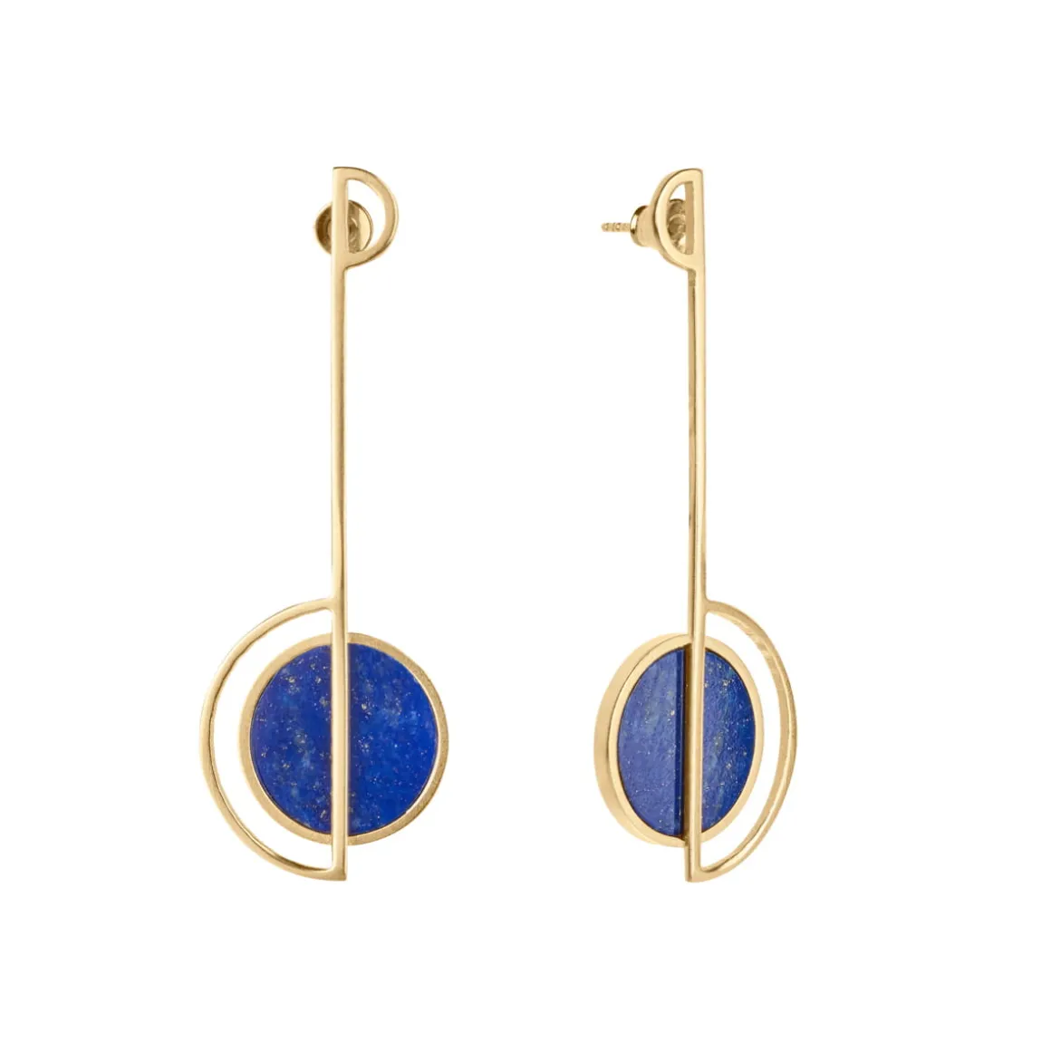 Kolczyki wykonaliśmy z pozłacanego mosiądzu w naszej pracowni jubilerskiej. Smukłą, podłużną formę ozdobiliśmy okrągłym kamieniem lapis lazuli, który nawiązuje do księżycowej pełni. Ta jest symbolem światła i rozkwitu – przypomina, że każdy ma w sobie potencjał by w pełni rozbłysnąć. Lapis lazuli otoczyliśmy delikatną, pozłacaną oprawą. Całość ozdobiona została ażurowym symbolem sierpu Księżyca. Konstrukcja z półokrągłymi i prostymi liniami nadaje kolczykom lekkości, a asymetryczne ułożenie – odważnego charakteru.