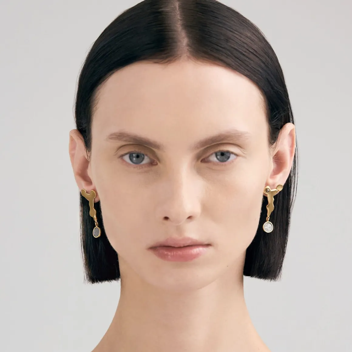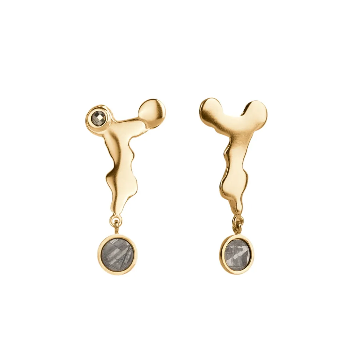 Kolczyki na sztyft z kolekcji Meteoros zostały wykonane ręcznie z pozłacanego mosiądzu. Stworzone w nieprzewidywalnym procesie lania metalu, zyskały miękną, niemal płynną formę, która od razu przyciąga wzrok. Projekt kolczyków został zainspirowany konstelacjami gwiazd, co widać w układzie elementów. Kolczyki mają smukły, rozwidlony na górze kształt. Na dole znajdują się zawieszki z fragmentami meteorytu Aletai. Kamień jest okrągły i ma naturalną, srebrzystą powierzchnię o jodełkowej strukturze. Unikalna barwa meteorytu kontrastuje z ciepłym złotem otaczającej go oprawy. Dodatkowo jeden z kolczyków asymetrycznie zdobi fasetowany piryt o metalicznym połysku. Piryty uznawane są za kamienie wzmacniające siłę woli i determinację, co ułatwia pokonywanie przeszkód i dodaje motywacji. Dzięki temu świetnie wspierają realizację celów, zarówno w życiu osobistym, jak i zawodowym. Idealne połączenie? Spadające gwiazdy pobudzają wyobraźnię i zachęcają do marzeń, a piryty pomagają je zamieniać w rzeczywistość.