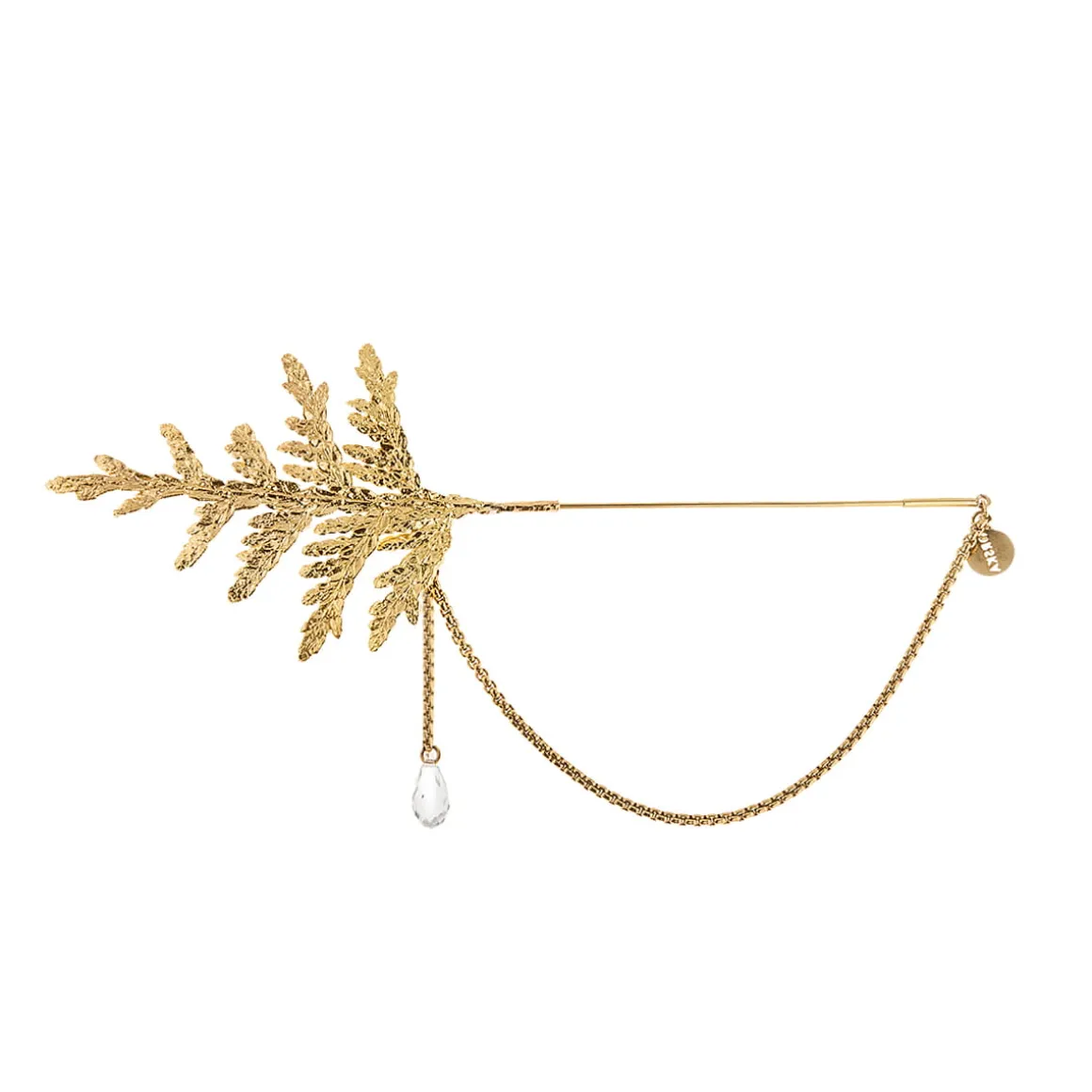 Złotą broszkę w kształcie gałązki thuji wykonano ręcznie z pozłacanego mosiądzu w warsztacie ORSKA. Lśniąca, długa gałązka o złocistej barwie, została wzbogacona delikatnym wiszącym łańcuszkiem, który jest zakończony transparentnym kryształem. Kropelka łapie światło i rozszczepia je, dzięki czemu powstają różnobarwnie mieniące się iskierki. Dzięki zastosowanej technice odlewu gałązki wyglądają jak te żywe, naturalnie rosnące w ogrodzie. Szczegółowe odwzorowanie faktury żywego krzewu nadaje broszce delikatności.