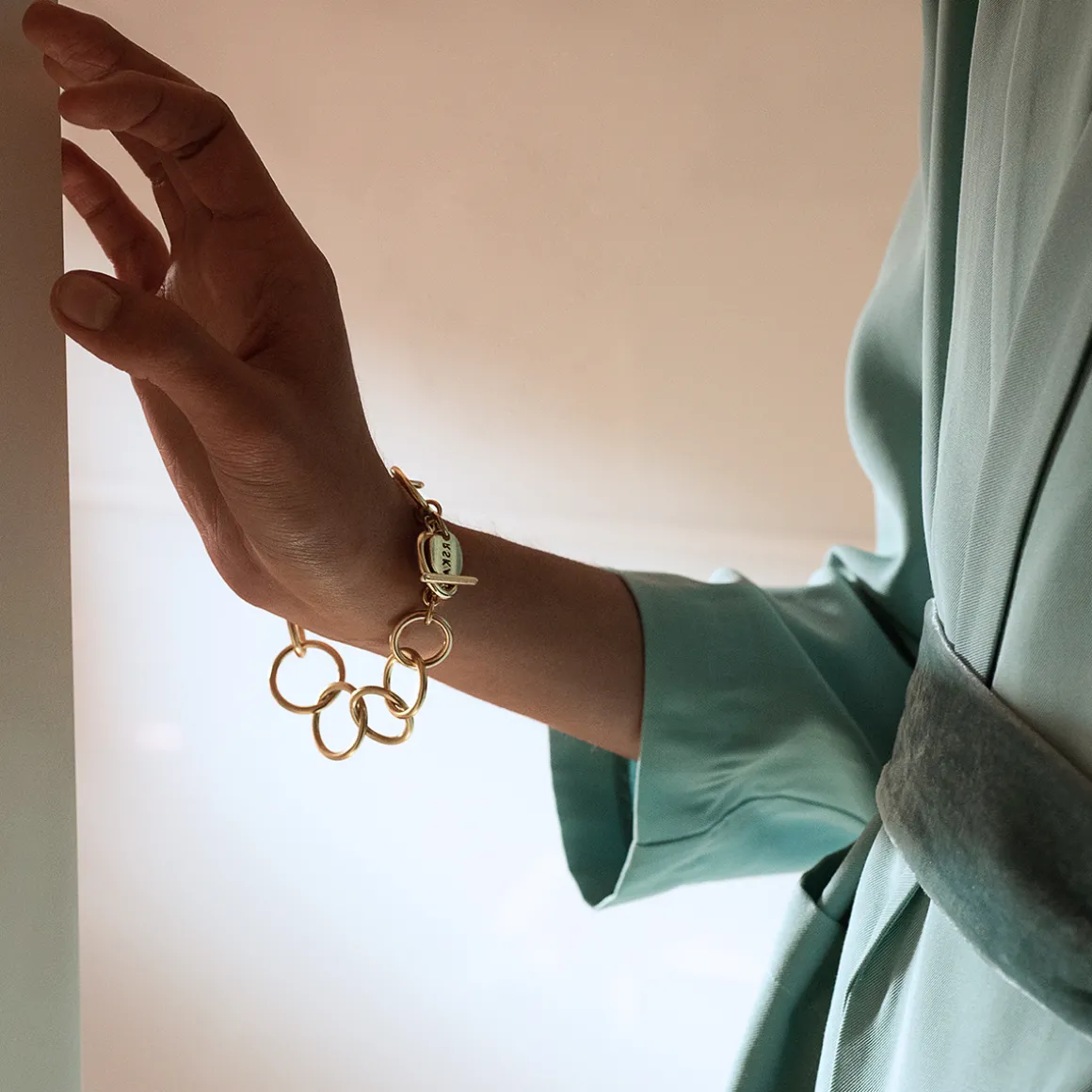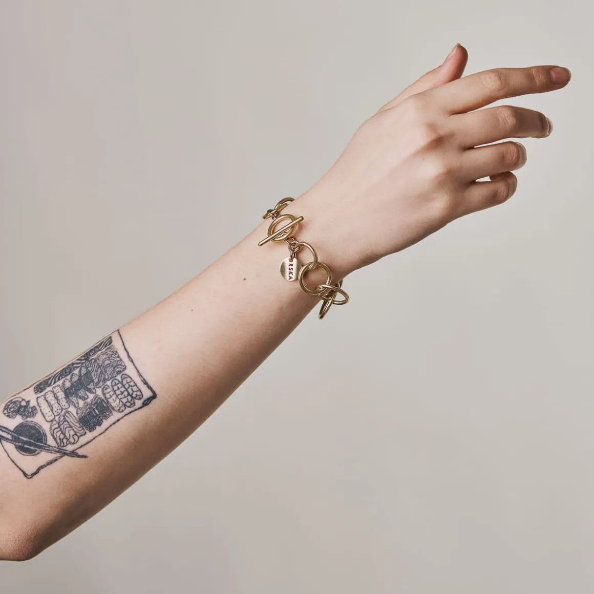 Artystyczna bransoletka z kolekcji Vintage została wykonana ręcznie z pozłacanego mosiądzu. Niewielkie obręcze o satynowej powierzchni zostały połączone w jedną całość zamykaną na ozdobny skobelek. Biżuterię zdobi podwieszone logo ORSKA. Klasyczna, elegancka bransoletka sprawdzi się jako uzupełnienie casualowych stylizacji.