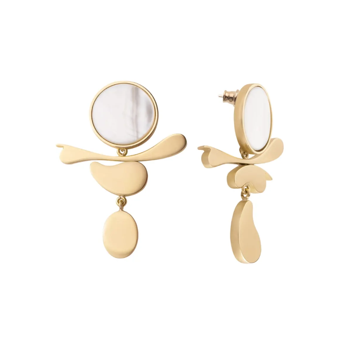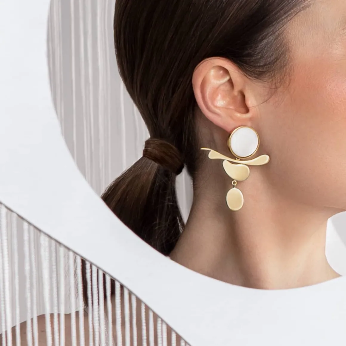 Artystyczne kolczyki zostały wykonane ręcznie. Miękkie, nieregularne kształty odlane w mosiądzu, a następnie pokryte złotem utworzyły efektowną kompozycję, przypominającą zdobne ornamenty art nouveau. Całość została ozdobiona masą perłową oprawioną w okrągłą, metalową formę. Wiszące kolczyki, mimo dekoracyjnej formy, mają elegancki charakter. Nie są zwykła ozdobą, lecz same w sobie tworzą kreację!