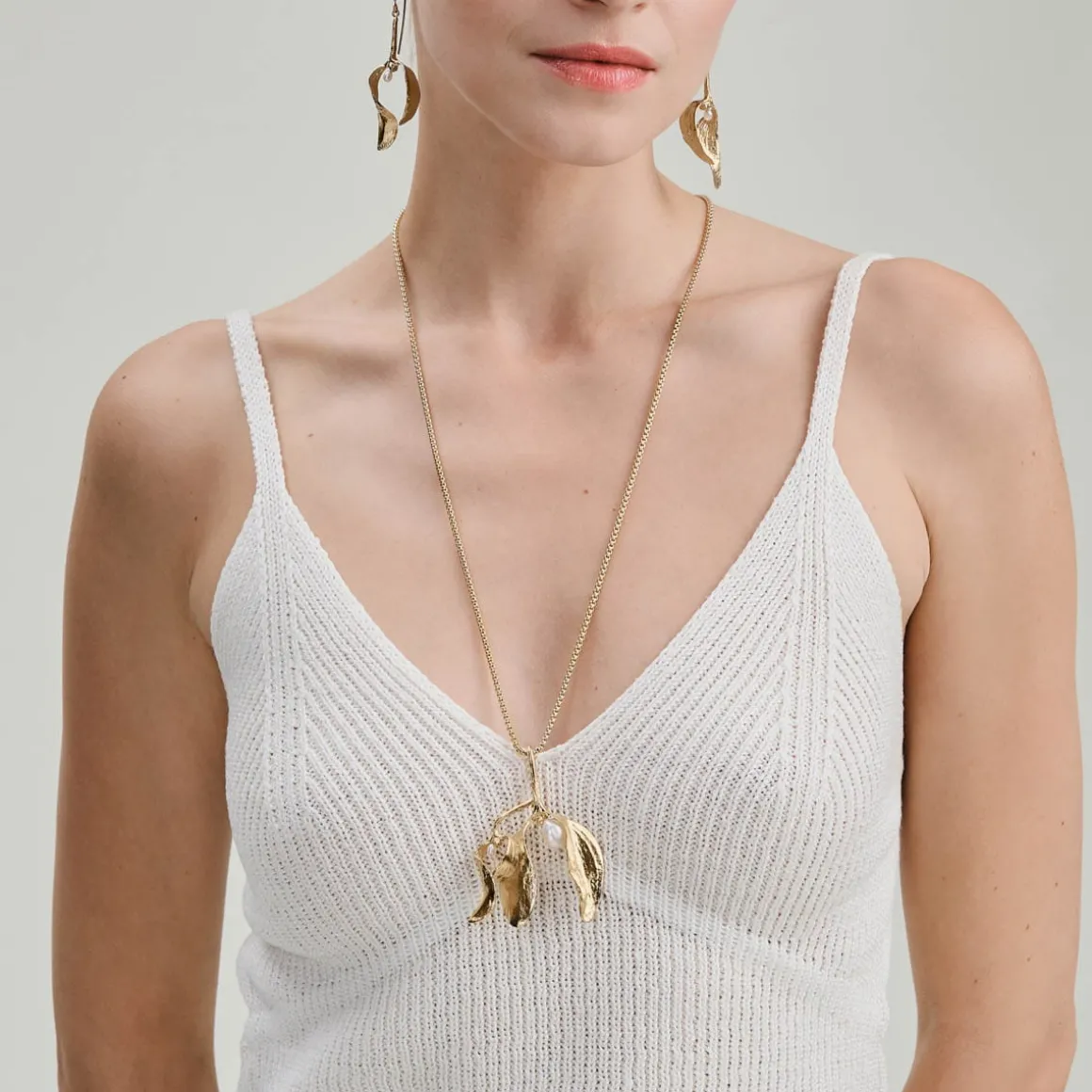 Ręcznie wykonany naszyjnik inspirowany jemiołą. Roślina ta od starożytności uchodzi za dar bogów i panaceum na wszystkie dolegliwości. Witalność jemioły jest tak silna, że nawet na bezlistnym drzewie pozostaje wiecznie zielona. Warto zatem skorzystać z jej magicznych mocy, gdyż noszona na szyi przynosi dobrobyt, chroni przed złem i co najważniejsze, umacnia związki dusz i ciał. Roślina została odtworzona w rzeczywistym kształcie i rozmiarze. Zawieszkę uszlachetniono perłami hodowlanymi.