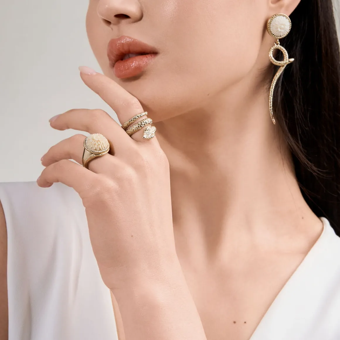 Dawniej sygnety nosili przede wszystkim mężczyźni, którym służyły jako pieczęcie do laki. Dziś już jednak nikt o tym nie pamięta i sygnety zdobią dłonie bez względu na płeć. Nie mają już też żadnej dodatkowej funkcji, poza tą najważniejszą – przyciągać uwagę i kraść komplementy. Sygnet z białą chryzantemą z kolekcji biżuterii Kembali zestaw z delikatną obrączką z kolekcji Body lub minimalistycznym pierścionkiem z kolekcji Moon. Nie bój się efektownych połączeń! Noś go śmiało z dużymi bransoletkami np. szeroką pozłacaną bransoletką z kolekcji Moon. Dobieraj kolczyki, naszyjniki i broszki – twórz zestawy, które podkreślą Twoją osobowość. Z uwagi na swoje symboliczne znaczenie pierścionek z białą chryzantemą będzie doskonałym prezentem dla bliskiej osoby, której dobrze życzymy. Może być też osobistym amuletem lub po prostu, piękną ozdobą.