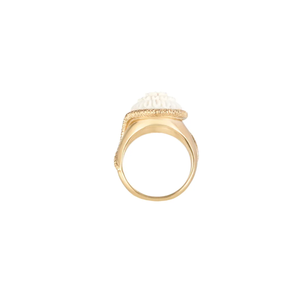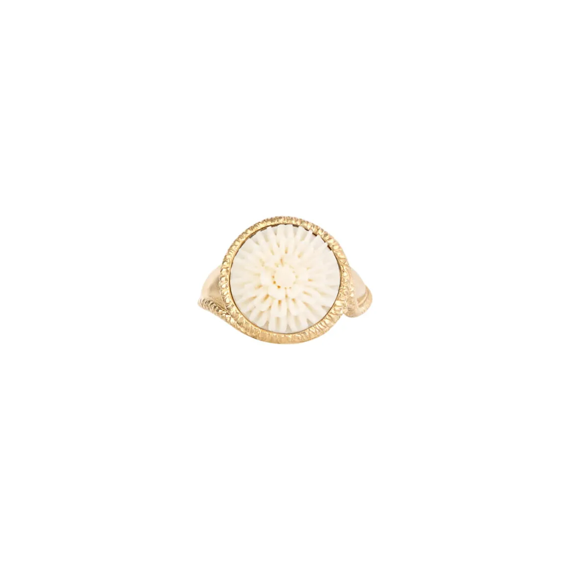 Sygnet z rzeźbioną białą chryzantemą z kolekcji Kembali